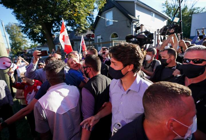 Protesters throw small rocks, debris at Trudeau as he leaves Ontario campaign stopTrudeau was leaving the event when he was surrounded by angry protesters, some of whom appeared to be throwing handfuls of gravel and debris at the party leader.PoliticsSep 6, 2021