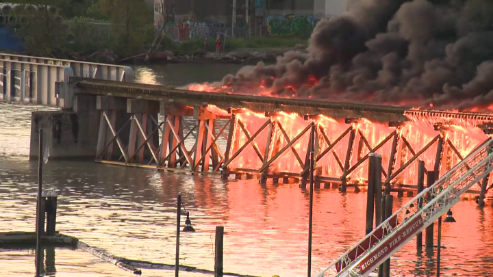 Richmond railway bridge fire extinguished, air quality bulletin endedA decommissioned rail crossing over the Fraser River caught fire on Thursday evening, producing billowing smoke seen across the region.FireJun 20, 2024