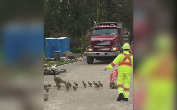 VIDEO: Over 40 baby geese slow down construction on Granville Island seawallNot all the geese were quick to make the crossing, with a few stragglers taking up the rear after a little coaxing from the worker.May 11, 2017