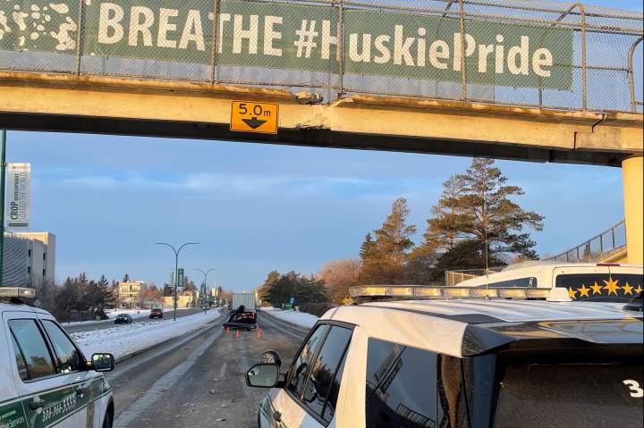 Saskatoon’s College Drive to fully reopen after crane struck pedestrian walkwayA pedestrian overpass was hit by a truck with a crane on Dec. 7, which created damage and knocked it out of alignment.CanadaDec 20, 2021