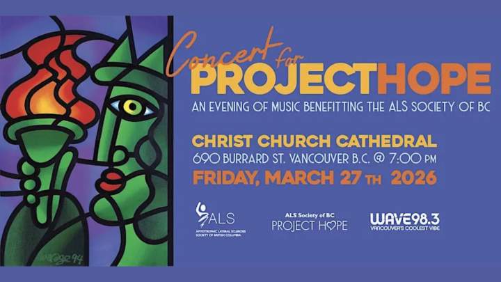 The Concert for Project HopeFriday, March 27, 2026, Vancouver’s rich music community joins together for a powerful night of song at the 2026 Concert for Project Hope, an inspiring benefit concert in support of the ALS Society of British Columbia and the Society’s PROJECT HOPE initiative. The event takes place at the historic Christ Church Cathedral (Downtown Vancouver’s oldest...MusicMar 27