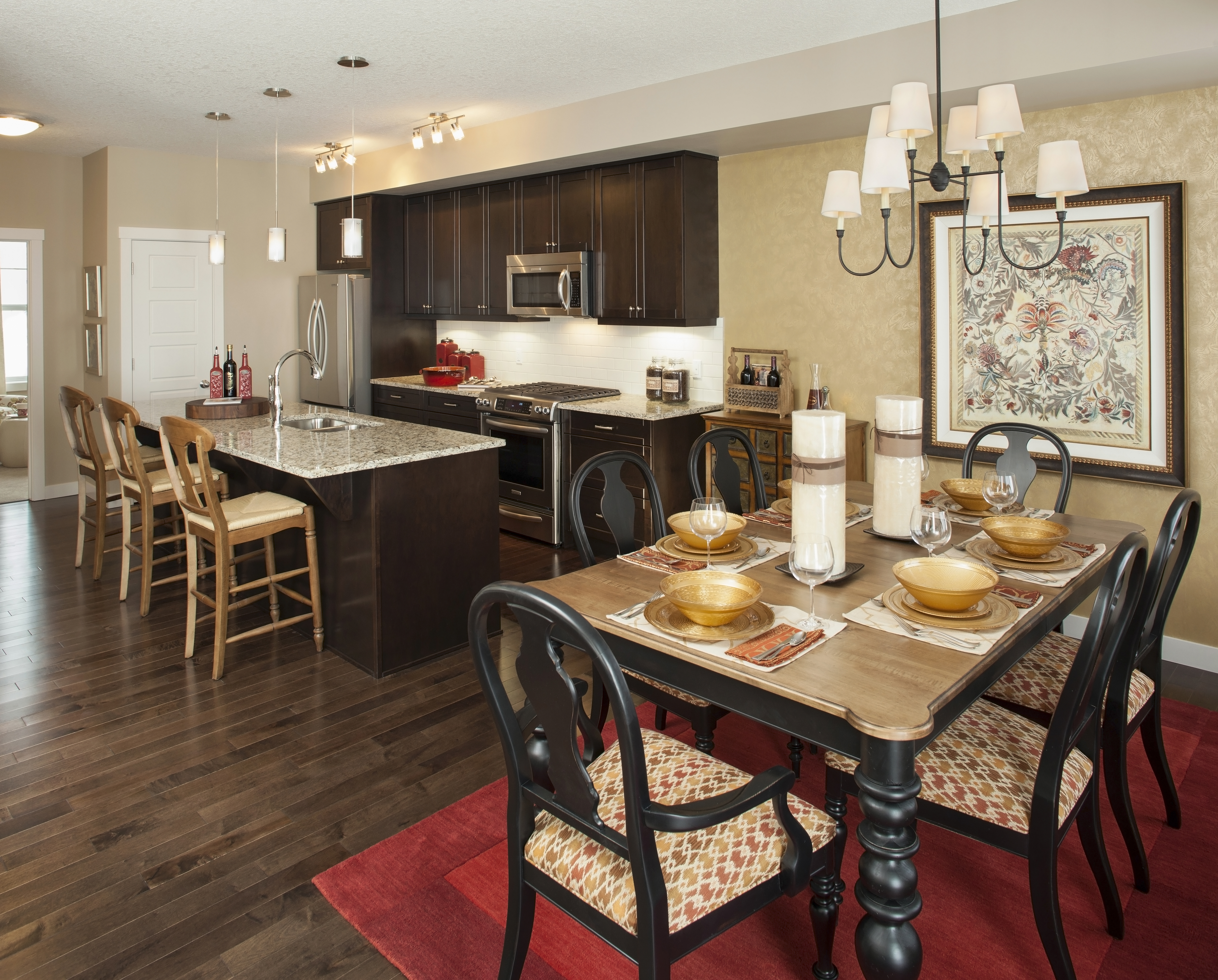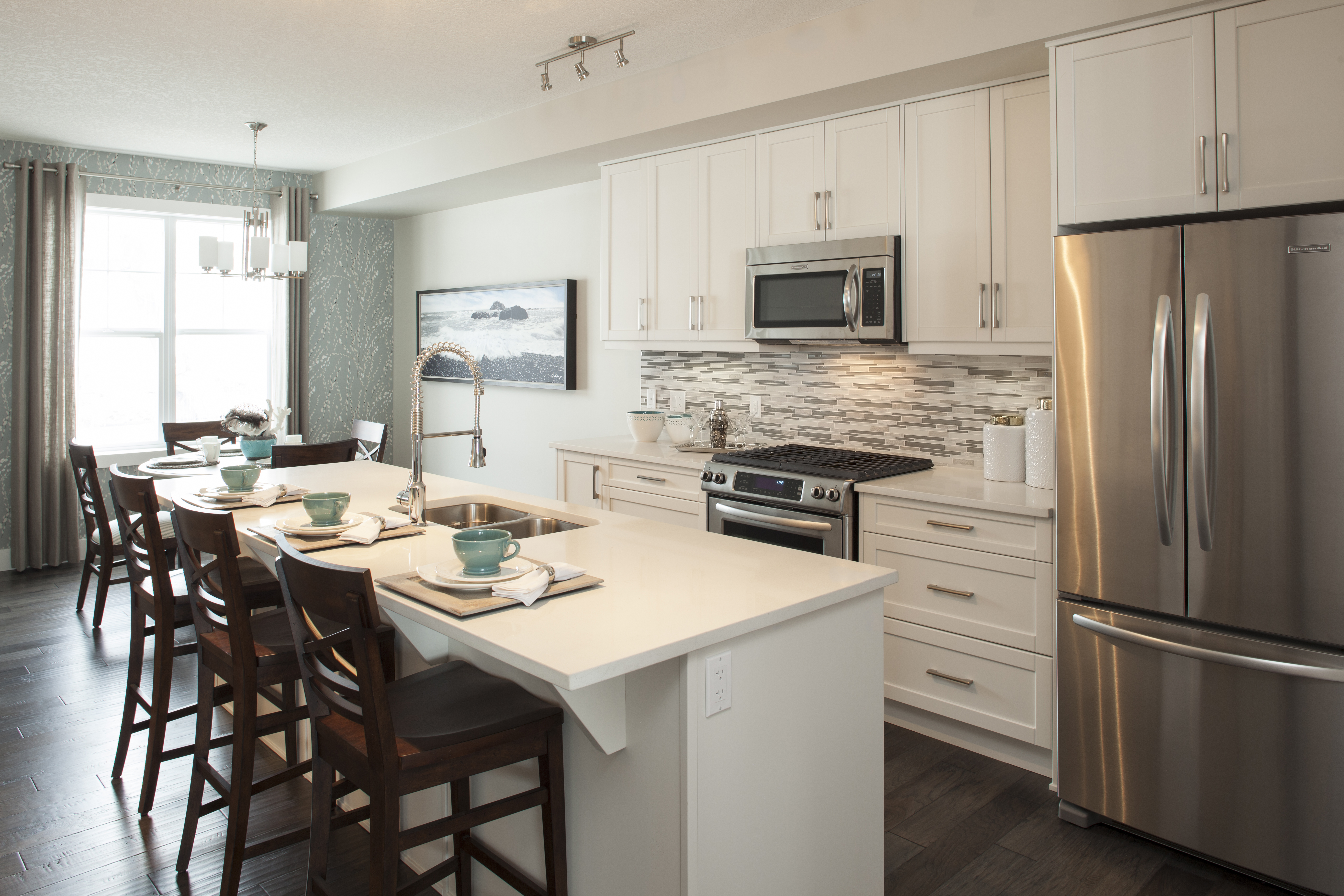 Developers like Brookfield Residential kept all that in mind when creating their stacked townhomes in Cranston’s Riverstone. The single-level units are 1,400 to 1,660 square feet, with basements for storage and double attached garages. They’re surrounded by the natural beauty of Fish Creek with views of the Bow River, which means there’s outdoor space to enjoy, minus the yardwork.