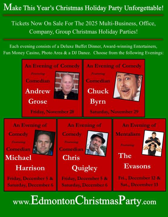 Multi-Business, Group, Office, Company Christmas Holiday Company Featuring Comedian Michael HarrisonMake This Year’s Christmas Party Unforgettable! Each evening consists of a Deluxe Buffet Dinner Award-Winning & Clean Entertainers Fun Money Casino Photo Area and a DJ Dance. Tickets are $99 per person including GST & Gratuity and must be pre-purchased. Open to groups/companies from 2 – 500 guests based on availability. Dates Venues and Entertainers...OtherDec 6 - Dec 7