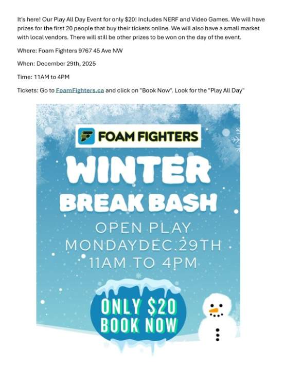 Winter Break Bash – Play All Day!Beat the winter blues on Monday, December 29 with Foam Fighters’ “Play All Day” event. Families can enjoy unlimited foam dart battles and full access to the Gamers Lounge for one price. The event also features a special pop-up market showcasing local vendors and “kidpreneurs,” giving the community a chance to support young business owners...OtherDec 29