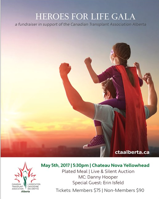 Heroes For Life Gala“Heroes for Life” is the theme of this year’s Annual Gala put on by the Canadian Transplant Association, (Alberta Division.) This is a fundraising event, recognizing donors and donor families as being superheroes. The event celebrates life and hope by bringing together community leaders, business entrepreneurs and health professionals. The 2017 event will be held at the Chateau Nova Hotel on Friday May 5th, featuring the one and only Danny Hooper.OtherMay 5