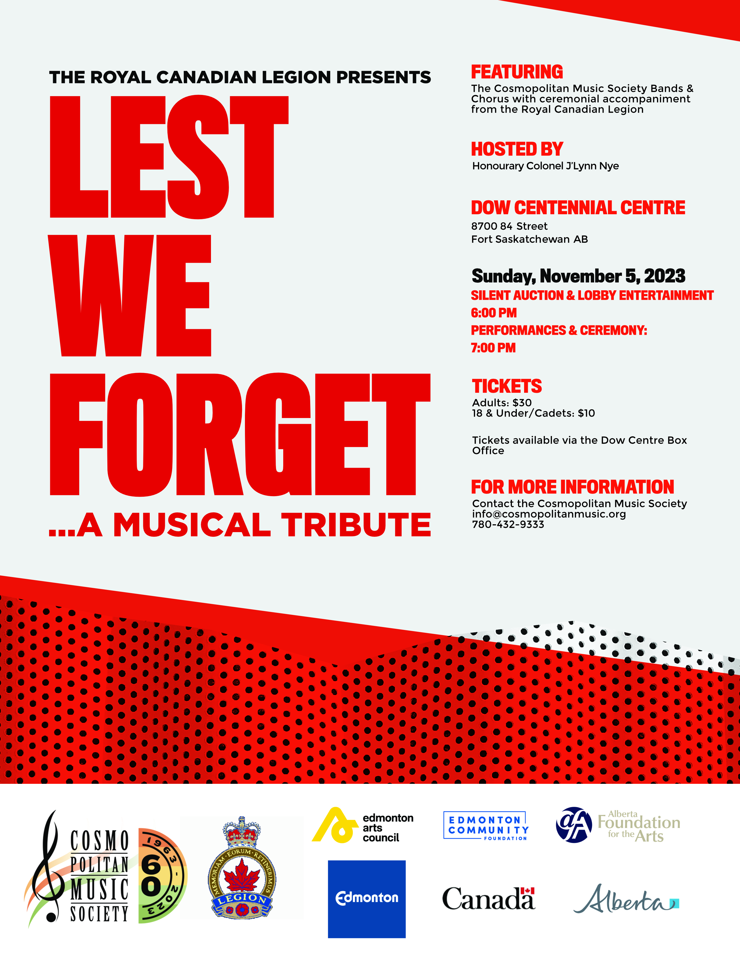 CMS & The Royal Canadian Legion Present: LEST WE FORGET… A MUSICAL TRIBUTE The Cosmopolitan Music Society (CMS) takes the stage at the Dow Centennial Centre (8700 84 Street, Fort Saskatchewan) in a touching musical and ceremonial tribute to the Canadian Armed Forces. Presented by The Royal Canadian Legion, the annual Lest We Forget… A Musical Tribute concert performs Sunday, November 5th. Hosted by Honourary Colonel J’lyn Nye and featuring the CMS bands and chorus performing popular wartime music and grand military marches, Lest We Forget… A Musical Tribute celebrates the men and women of our Canadian Armed forces through the parade of colours, remembrance at the cenotaph with The Last Post, and a photographic tribute. A Silent Auction and lobby entertainment start at 6PM; concert begins at 7PM. Tickets are $30 for adults and $10 tickets for 18 & under/all cadets. Tickets are available starting October 4th through the Dow Centre Box Office. (Questions? Ask the Cosmopolitan Music Society: T: (780) 432-9333; E: info@cosmopolitanmusic.org)