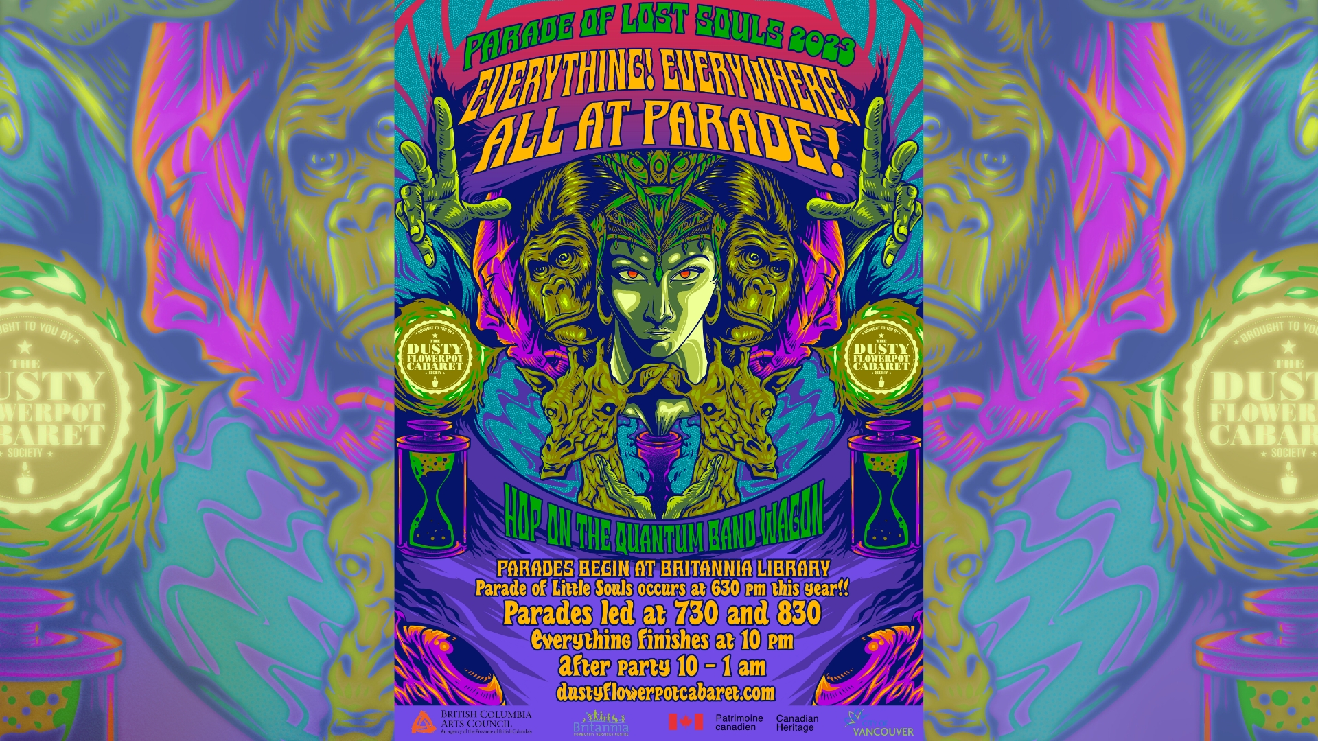 Mark your calendars, for something spooktacular is creeping your way! Dusty Flowerpot Cabaret’s Parade of Lost Souls returns with the theme Everything! Everywhere! All at Parade! Saturday, October 28th 6:30 p.m. – 10 p.m. FREE AND BY DONATIONS Inviting Halloween Enthusiasts to Unleash their Inner Artistic Souls for a Night of Spectacular Wonders The whimsical, spooktacular, and legendary Parade of Lost Souls returns on Saturday, Oct 28, casting its enchanting spell from 6:30 p.m. to 10 p.m. The beloved annual East Vancouver tradition, a blend of art, music, and dance, begins at the Britannia Library (1661 Napier Street), with new “choose-your-own-adventure” parades happening at 7:30 p.m. and 8:30 p.m., where you will have to choose between three bands going in three different directions! The Parade of Little Souls for young people occurs just before 6:30 p.m. Join the Thriller Flash Mob, immerse in the mystical aura of the Witches Dance Workshop, or step back in time with Do the Time Warp. Stay updated on surprises and details at dustyflowerpotcabaret.com/paradeoflostsouls and on social media @dustyflowerpotcabaret #ParadeofLostSouls #ParadeofLittleSouls. Join the event on Facebook: http://www.facebook.com/paradelostsouls. “Parade of Lost Souls is for the people and by the people,” says Kat Single-Dain, co-founder and artistic executive director of The Dusty Flowerpot Cabaret Society. “Our aim is to ignite the creativity that lives within all of us. Every year, our community collaborates to create the ultimate Halloween experience with a wide range of workshops, dances, a huge variety of music, and the most fantastic costumes you can imagine. In fact, we want you to imagine something more fantastic and wear it to the parade! This is a participatory community celebration that includes YOU and is offered absolutely free, with donations encouraged.” Through a diverse array of workshops leading up to the grandeur of the Parade of Lost Souls, participants are not just attendees but become an integral part of the performance, immersing themselves in dance, music, and artistry. Every soul is invited to help turn the community into a canvas of expressive art, echoing the unison of spirits and the enigmatic whispers of Halloween. EVENT DETAILS Where: Britannia Library and area located at 1661 Napier Street When: Saturday, October 28th, 2023 6:30 p.m.: Parade of Little Souls (Family-Friendly Procession), followed by the main Parade of Lost Souls Processions at 7:30 p.m. and 8:30 p.m. 10 p.m. – 1 a.m.: The Lost Souls After Party at The Wise Hall (1882 Adanac Street) Parade of Little Souls Beginning at 6:30 p.m., little souls will light up the night, illuminating the path for the grand spectacle that follows. The earlier start caters to the young and young at heart, a prelude to a night where dreams and reality dance under the moonlit sky. Parade of Lost Souls The moon will bear witness to a spectacle where each soul, each spirit, weaves a story, echoing the eternal dance of the cosmos. The choose-your-own-adventure processions commence hourly at 7:30 p.m. and 8:30 p.m. The Lost Souls After Party You’ve resurrected your identities, faced your fears, and saved your souls, and now it’s time to shake those bones and rejoice! As the clock strikes 10 p.m., the spirits will make their way to The Wise Hall, located at 1882 Adanac Street, soaring into the witching hours and rejoicing in the magical blend of the night. Workshops and Pre-Parade Preparations The embrace of magic is woven through workshops designed to kindle the soul’s creative spark. Dance to the enigmatic tunes of the Thriller Flash Mob, immerse in the mystical aura of the Witches Dance Workshop, or step back in time with Do the Time Warp. More information at dustyflowerpotcabaret.com/paradeoflostsouls Happy Hour Drop-In Fridays A drop-in evening of variety at the Dusty Flowerpot Cabaret! Join us at the studio on Fridays (Oct 6, 13, & 20) at 2050 Scotia St, entrance at loading bay. where you can do a variety of things, including: • Make a costume • Buy a costume • Contribute to set decoration preparations • Meet potential collaborators • DJ (or play music) for the folks enjoying the space • Perform karaoke on our custom LED dance floor • Get a tour of the new improvements of the space • Meet with the crew of the Parade • Talk about any ideas you may have! • Volunteer with the team Be the Spirit of the Parade Marshalled by The Dusty Flowerpot Cabaret, the Parade of Lost Souls echoes the mystery of the unseen, the untold, and the unimaginable. It’s a dance of spirits, an assembly of souls, echoing the cryptic whisper of All Hallows’ Eve. Your Support Keeps the Magic Alive A magical blend of performance, music, and art; the Parade of Lost Souls thrives on the generosity of the community. With a suggested donation of $10, each soul contributes to the echoing enchantment, ensuring that the mystical dance continues year after year. “We extend our gratitude to the British Columbia Arts Council, Britannia Community Services Centre, Canadian Heritage, and The City of Vancouver. Their support and belief in the power of community-driven arts and culture have been instrumental in bringing this event to life. Together, we’re not just creating an event, but fostering a legacy of artistic expression and community collaboration,” says Single-Dain. With a strong mandate to create and present multidisciplinary interactive arts and events with a focus on community engagement and artistic excellence, The Dusty Flowerpot Cabaret is a non-profit society dedicated to curating and supporting original works of physical theatre in stages both traditional and site specific. The society hosts a live band swing dance each Tuesday night throughout the year at the Dusty Flowerpot studio, called The Swing Out, a speakeasy-like hub of dancers, musicians, and anyone who loves either of those!