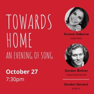 Towards Home October 27, 7:30pm Pyatt Hall Simone Osborne, soprano Gordon Bintner, bass-baritone Gordon Gerrard, piano For each of us, home is a notion we cherish. In a physical sense and probably even more so in an emotional one, it carries layers of meaning. Internationally acclaimed Canadian opera stars Simone Osborne and Gordon Bintner join City Opera Vancouver’s new Artistic Director Gordon Gerrard for Towards Home, an evening of song. The program will include lesser-known treasures by Schubert, Finzi, Viardot and some of the new generation of Canada’s great composers for the voice.