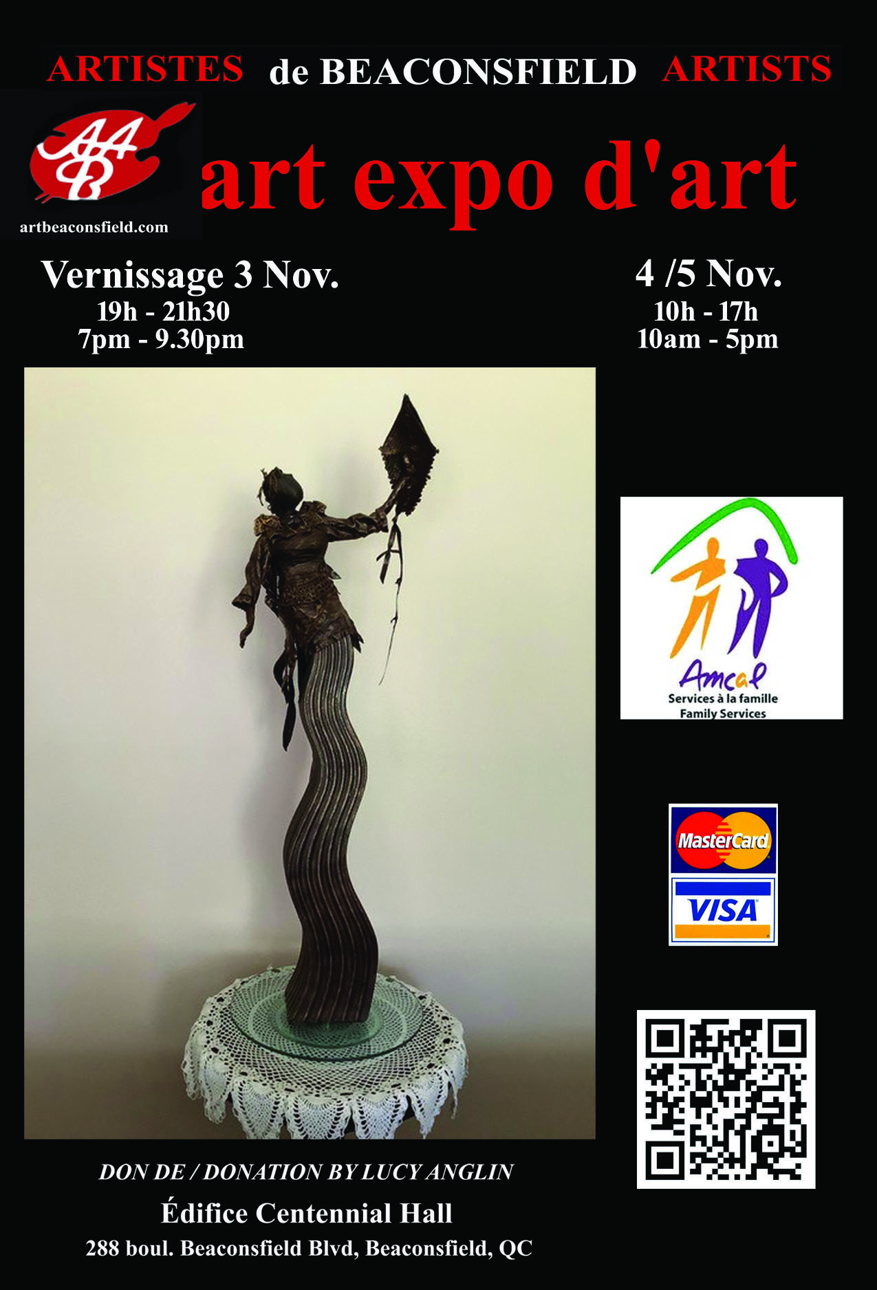 The annual Beaconsfield Artists Association presents their Autumn Expo starting with a delightful vernissage on Friday, November 3rd at 7:00 pm to 9:30 pm and continues on November 4th and 5th at 10:00 am to 5:00 pm. A large variety of paintings and sculptures will be offered. A percentage of sales will be donated to Amcal Family Services as well as proceeds from a raffle entitled “Come Fly A Kite” kindly donated by artist and sculptor, Lucy Anglin. Everyone is welcome to browse the artworks and discover the charming Centennial Hall located at 288 Beaconsfield Blvd, Beaconsfield H9W 4A7