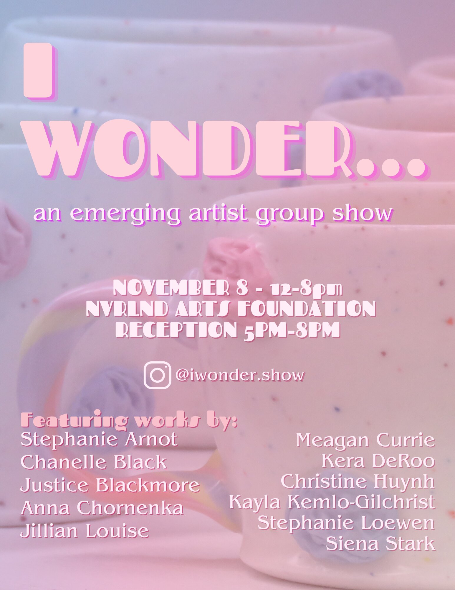 I Wonder is a free emerging artist pop-up gallery event at nvrlnd. Arts Foundation on November 8th showcasing the work of 13 different new artists. Gallery space opens at 12pm, reception 5pm-8pm. Come for good art, good food, and good vibes.