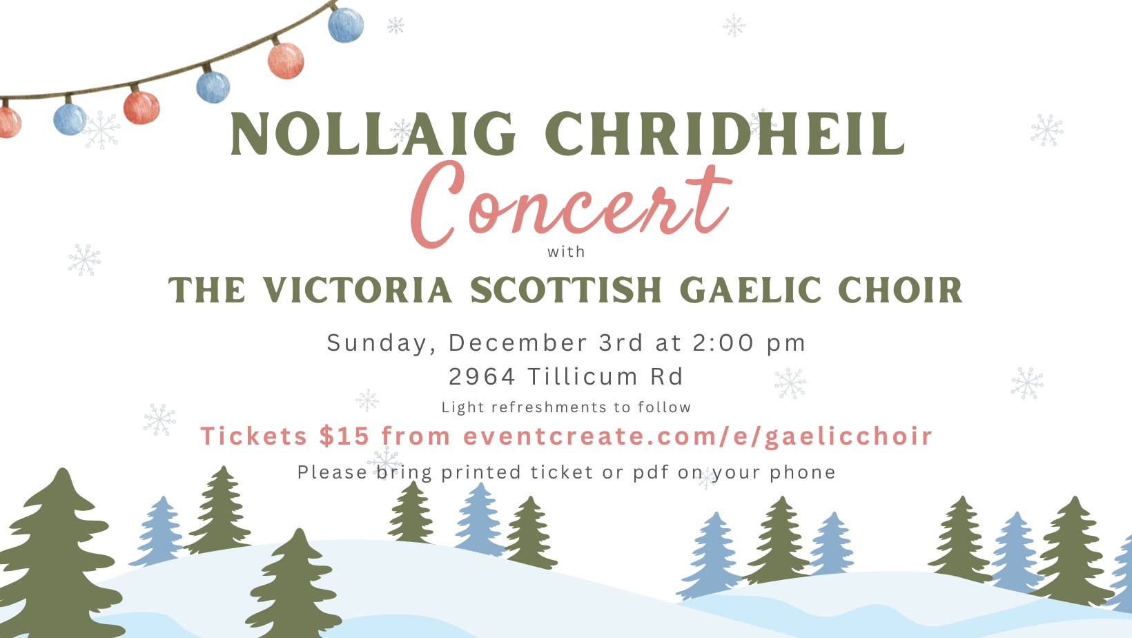 Join The Victoria Scottish Gaelic Choir for our annual Christmas concert and enjoy a warm and cheerful afternoon of traditional Gaelic songs as well as new and old holiday favourites. There will be tea and light refreshments following the concert. Tickets are $15 and can be purchased at eventcreate.com/e/gaelicchoir. Please bring your printed or electronic ticket to the performance.