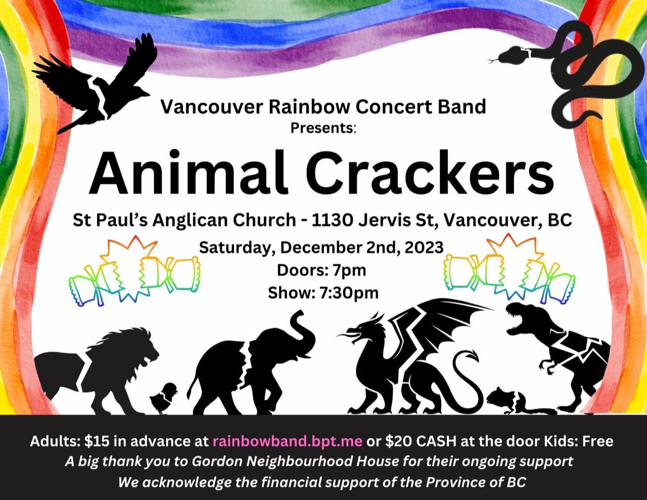 Experience a sensational evening of music, merriment, and dazzling performances with the Vancouver Rainbow Concert Band! In her 10th consecutive appearance as the special guest MC and performer, we’re thrilled to welcome back the one and only Ms. Whoopsie Daisy! Our holiday-themed show, ‘Animal Crackers,’ will fill your heart with the sweet scent of pine and the freshness of a new season. Get ready for a toe-tapping, tail-wagging holiday extravaganza like no other, featuring furry and cheerful tunes like ‘Peter and the Wolf,’ ‘The Bare Necessities,’ ‘I Want a Hippopotamus for Christmas,’ ‘The Chipmunks Song,’ ‘Baby Elephant Walk,’ ‘The Pink Panther,’ and ‘Birdland,’ just to name a few.