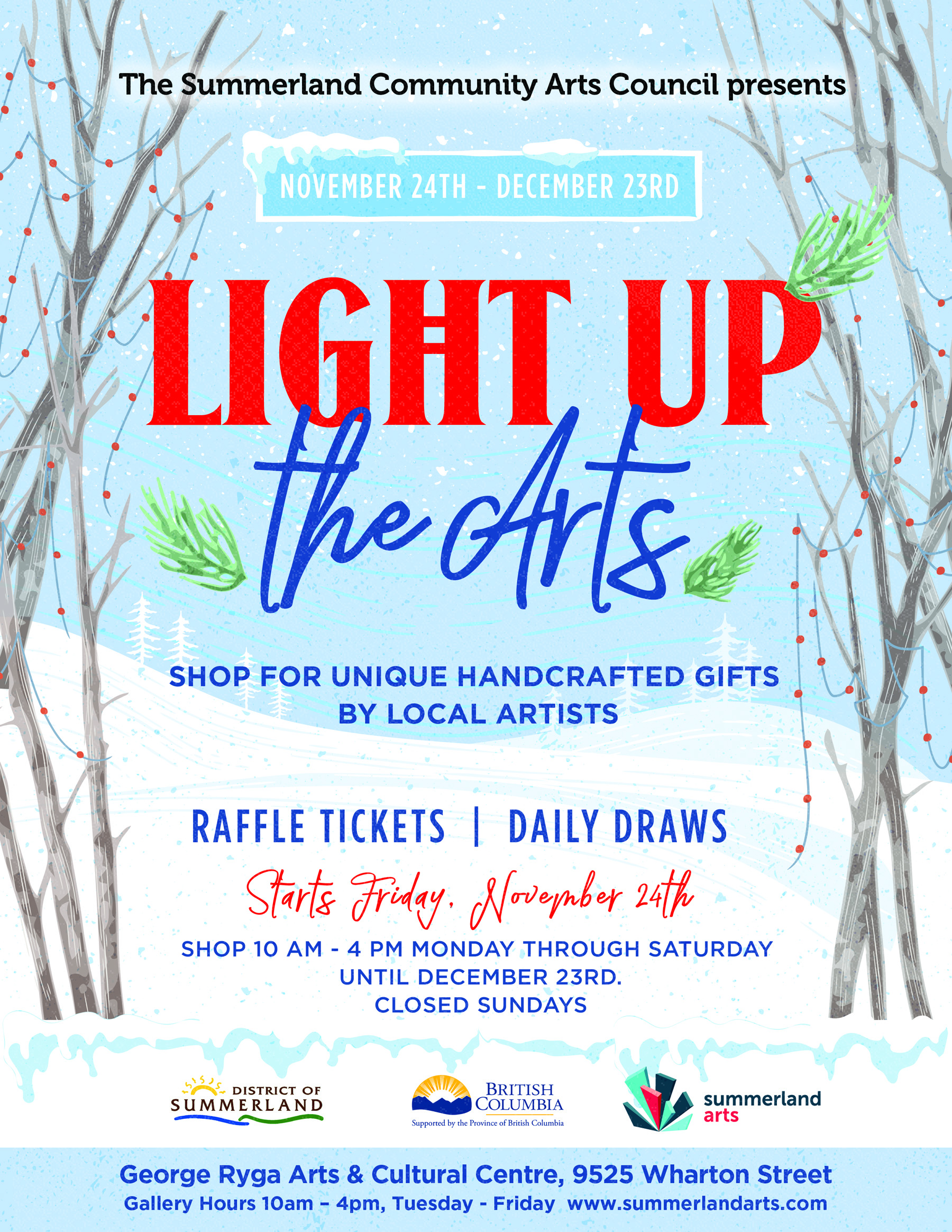 Light up the Arts starts on Friday, November 24th and runs until Saturday, December 23rd! You’ll find beautiful, handmade items from our creative arts community, perfect for your Christmas gift-giving. Candles, pottery, knit and crochet wear, paintings, jewelry, books. leather bags and belts and more! We’ll be holding a daily draw for a handmade Christmas ornament of your choice and you can enter our raffle for eleven different and fabulous prizes! We’re thrilled to be joined by Chef Andy and his lovely wife Loraine. who will be here from 5 – 9 pm with their delicious meat pies and other wonderful food items! We’re excited to announce that we’ll also be joined by Thornhaven Estates Winery from 5 – 8:30 pm! The always knowledgeable and quick with a joke Danny Evanishen will be your sommelier! Enjoy a cup of hot chocolate and cookies and warm up while you browse. The Summerland Singers and Players will be holding a Sing-a Long outside in the greenspace from 6 – 6:30 pm, and everyone is invited to join in. Come to the Ryga Arts & Cultural Centre for the start of Light up the Arts on November 24th from 5 – 9 pm. 9525 Wharton St. right next to the Summerland Museum, who will also be celebrating the evening.