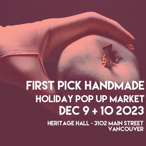 The 3rd annual First Pick Handmade Holiday Pop-Up Market returns this December to transform Heritage Hall into a 3,300-square foot boutique and sustainable shopping event from Saturday, December 9 to Sunday, December 10 at 3102 Main Street, Vancouver, from 11:00 am to 6:00 pm daily. First Pick Handmade events are well known for featuring a curated offering of high-quality and handmade fashions for your person and home. This year, over 30 designers are featured with all items made locally, by hand, and do not feature mass production.