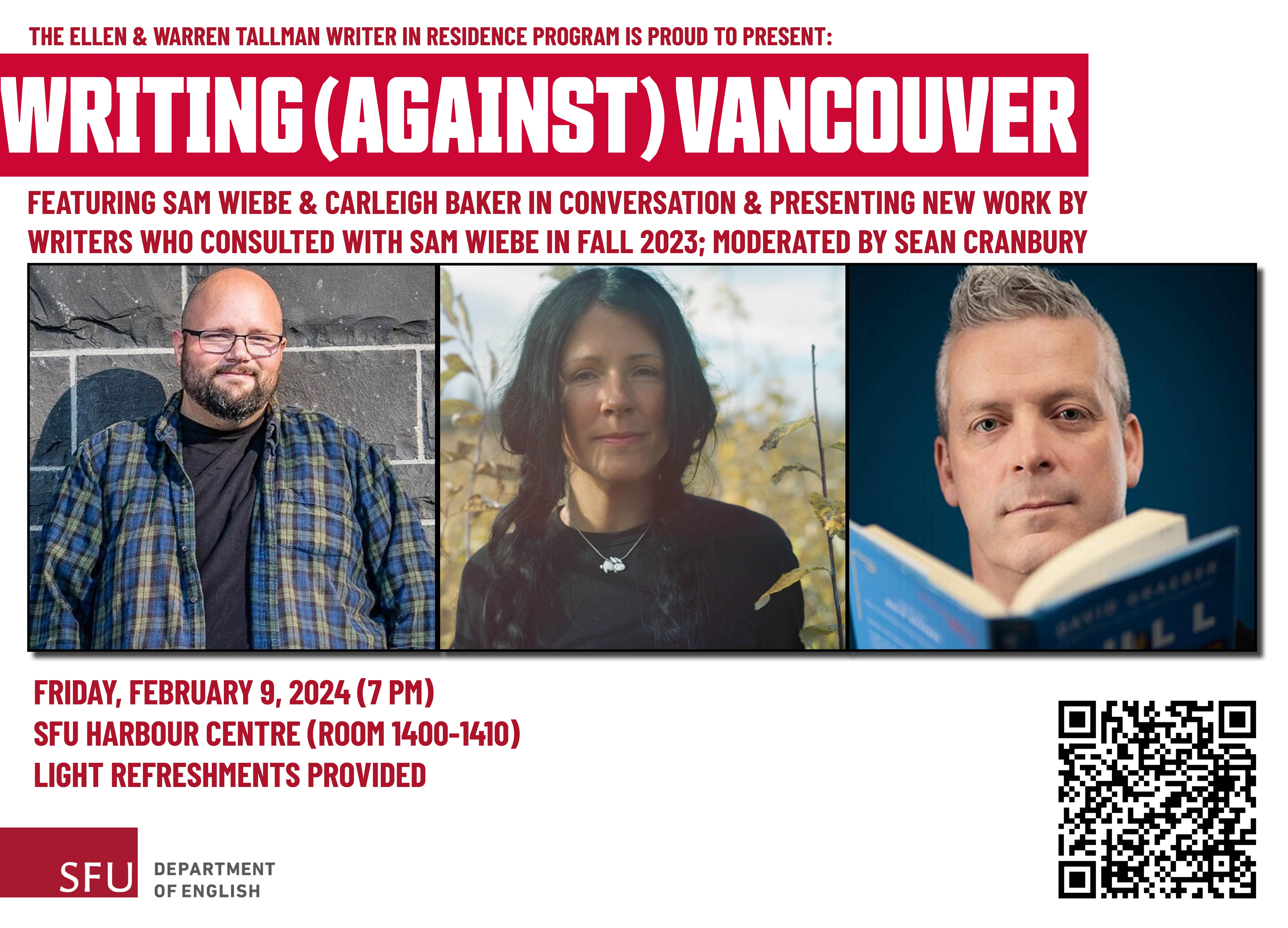 Join Simon Fraser University’s Department of English for Writing (against) Vancouver on Friday, February 9th (7 PM) at SFU’s Harbour Centre campus (Room 1400-1410). This event spotlights the work of Vancouver-based, short story writers, Sam Wiebe & Carleigh Baker in conversation, moderated by Sean Cranbury. In addition, we will hear the work of writers who consulted with Sam Wiebe, who was the Ellen & Warren Tallman writer-in-residence. A Q & A and reception will follow the discussion.