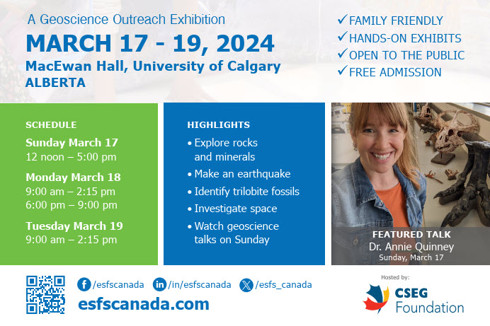 ESfS is a fun, educational, and dynamic geoscience outreach event in which students, families, youth groups, and the public are given an opportunity to explore the wonders of Earth science. The event encompasses interactive, hands-on exhibits that are showcased in four themed pavilions. Admission is free! March 17-19, 2024 MacEwan Hall at the University of Calgary, Alberta Sunday March 17 12 noon to 5:00 pm Monday March 18 9:00 am to 2:15 pm and 6:00 pm to 9:00 pm Tuesday March 19 9:00 am to 2:15 pm