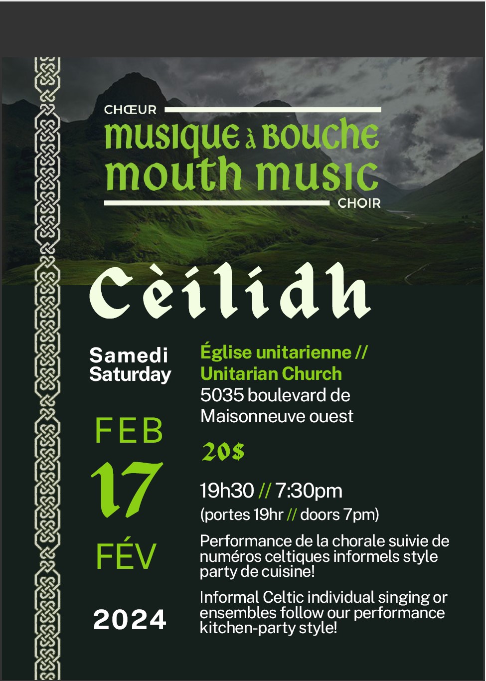 Discover Montreal’s Celtic choir: Musique à bouche/Mouth Music Come to the Cèilidh! Saturday, February 17, 2024 7:30 pm Unitarian Church, 5035 de Maisonneuve West $20.00 On February 17th the public is invited to a cèilidh or kitchen-party style concert to hear Mouth Music’s rich repertoire of traditional Scottish, Welsh, Manx and Irish songs. Mouth Music, born in 2017, embraces the exciting song traditions of the Celtic world with unique choral arrangements of work songs, love songs, Irish lilting and Scottish puirt à beul. Thrilled to be performing again after the hiatus that has affected so many ensembles, the choir will be tipping its tam to Saint Valentine. Linda Morrison, Canada’s beloved singer/songwriter and choir director, was travelling on a bus in Scotland when she heard a choir singing in Scottish Gaelic. She was smitten with the songs, some of which she had heard as a child from her grandparents. She studied the language and began holding informal Gaelic language and music workshops back home in Montreal. People were so enthusiastic that they asked her to start a Celtic choir. Morrison was awarded the Quebec Thistle Council prize for Scottish music, has won a gold medal at the North Carolina Mòd festival and BBC Scotland has just featured Mouth Music and Linda in Immigration Tracks, a new TV series. Thig crioch air an saoghal, ach mairidh gaol is ceòl The world will pass away, but love and music last forever – Scottish Gaelic proverb -30- For interviews with Linda Morrison, Director, Musique à bouche/Mouth Music please contact: Name Linda Morrison Phone number 514-279-0434 Email linda@lindamorrison.com