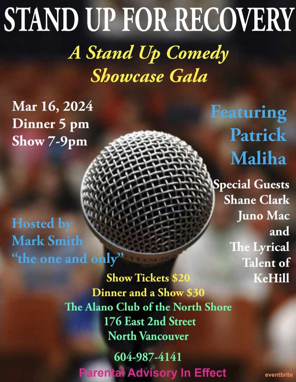 Live, love, and laugh. Fun in recovery is real. Come and join us for an evening of laughter Dinner served at 5pm Show Starts at 7pm Featuring: Patrick Maliha Special Guests: Shane Clark and Juno Mac also Presenting the Lyrical Talent KeHill Hosted by Mark Smith “the one and only” Show $20 Dinner and a Show $30