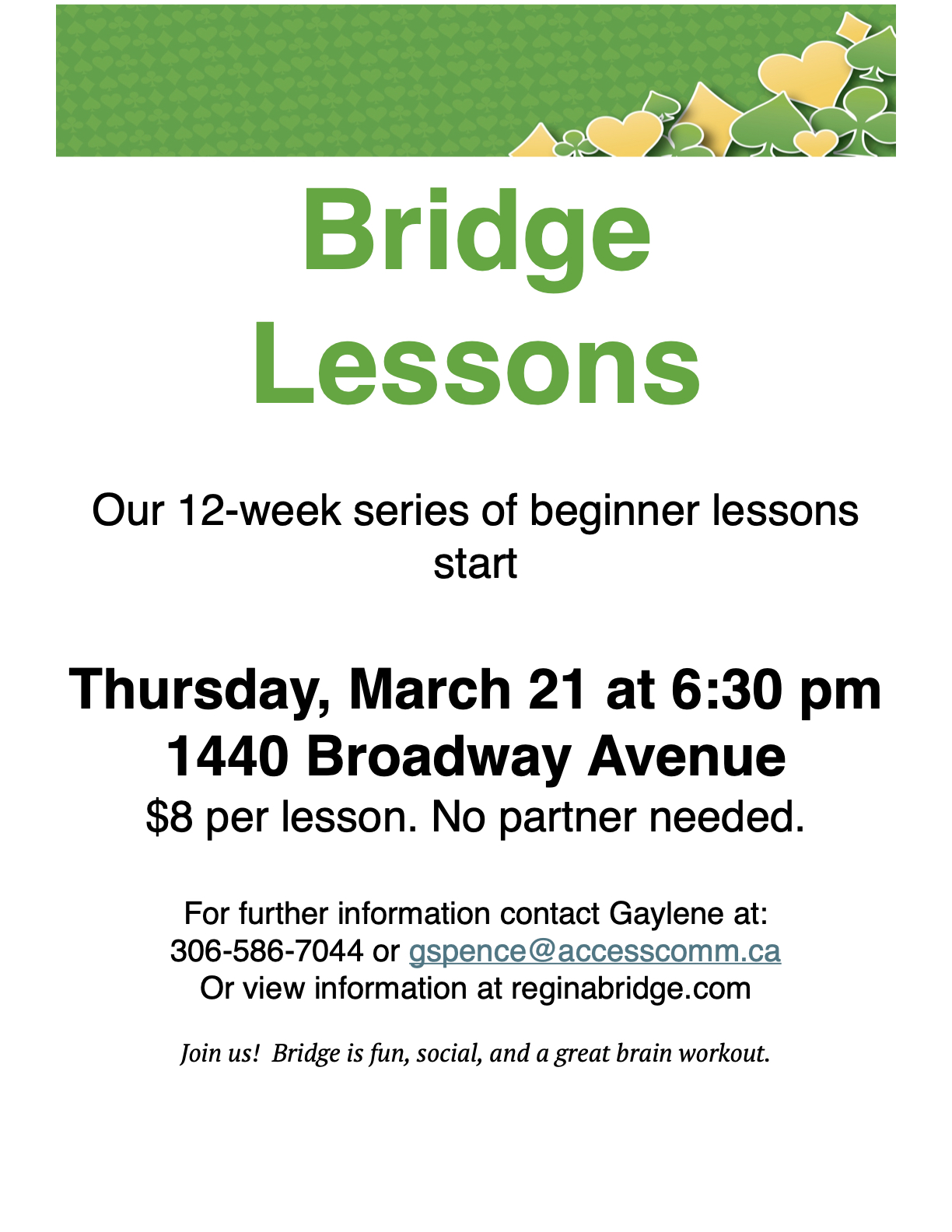 The Regina Bridge Club will be offering a series of bridge lessons designed for newer players. Lessons start March 21, 2024 and are $8 each. No partner is required. Contact Gaylene at (306)586-7044 or gspence@accesscomm.ca for more information.