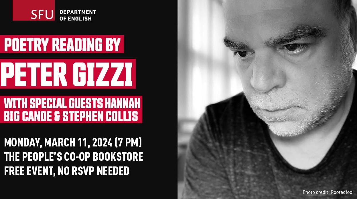 Renowned American poet Peter Gizzi will be reading at The People’s Co-op Bookstore on Monday, March 11th at 7 PM. He will be joined by SFU English Professor Stephen Collis and SFU English alumnus Hannah Big Canoe. This is a free event and no RSVP is required. For more information, check out the event link.