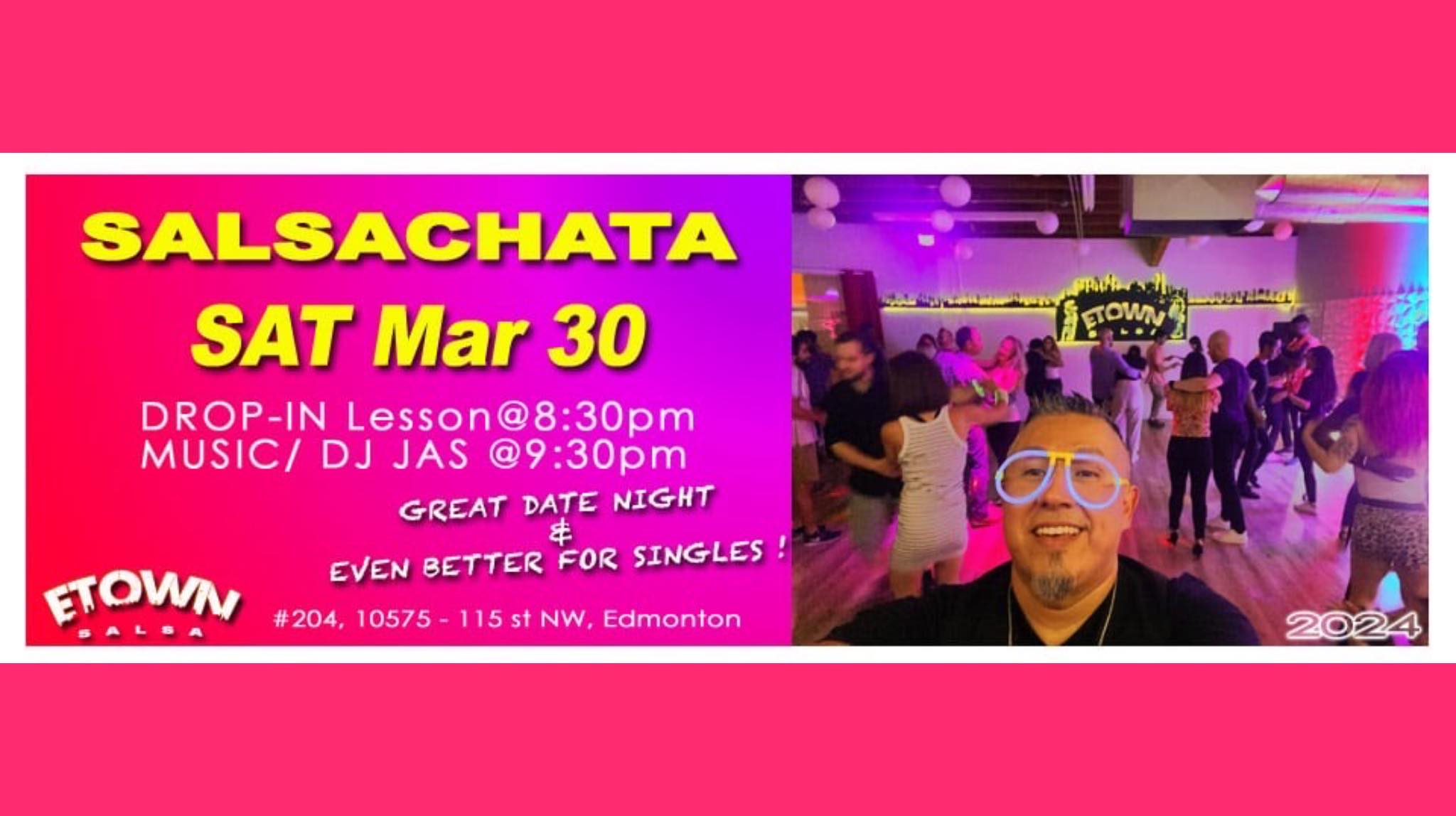 SALSACHATA LATIN SOCIAL NIGHT (SALSA & BACHATA) A perfect night for couples and singles. SALSACHATA LATIN DANCE SOCIAL We’re back for another epic night of Salsa and Bachata at ETOWNSALSA with DJ Jas! Event is 18+. Advance tickets are strongly recommended. SALSA & BACHATA SOCIAL DANCE WHERE: ETOWN SALSA Studio 10575 115 street WHEN: Saturday, March 30, 2024 @ 8pm CONTACT INFO:780-906-7939 TICKET INFO: $10 EXTRA DETAILS: (bring indoor shoes) Join us for a SPECIAL evening of SALSA & BACHATA dance social. This night is Perfect for Date night welcome all singles and couples You don’t need a partner. Bring your dance shoes and meet a lot of amazing people from all walks of life to enter our doors that night. But the best thing you don’t even have to chat you can just DANCE! And if you want to chat dance is usually the mode of choice and your loving it! Don’t think twice BUY YOUR TICKTES ONLINE! Agenda for the night Door open @ 8:00pm Salsa/Bachata lesson @ 8:30pm by Maestro Alex Rojas Social Dance @ 9:30pm until 1:00am DJ Jasfu for the night (Salsa & Bachata all night) Bring Indoor Shoes.