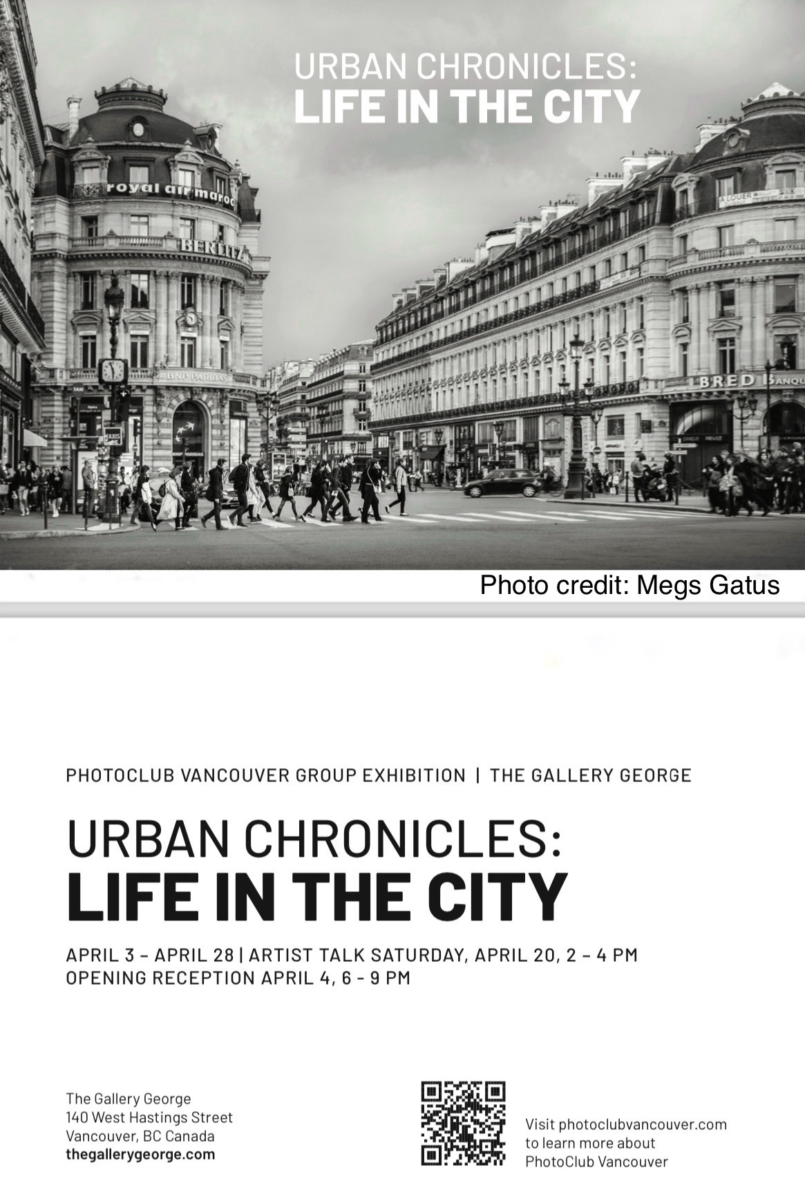 PHOTO CLUB VANCOUVER ARTIST TALK Saturday, April 20th from 2-4pm Free Entry “Urban Chronicles: Life in the City” This theme explores the multifaceted aspects of urban life. Photographers could depict the dynamic and diverse environments within city, showcasing the people, architecture, street scenes, and the juxtaposition of modern and historical elements that make urban areas unique