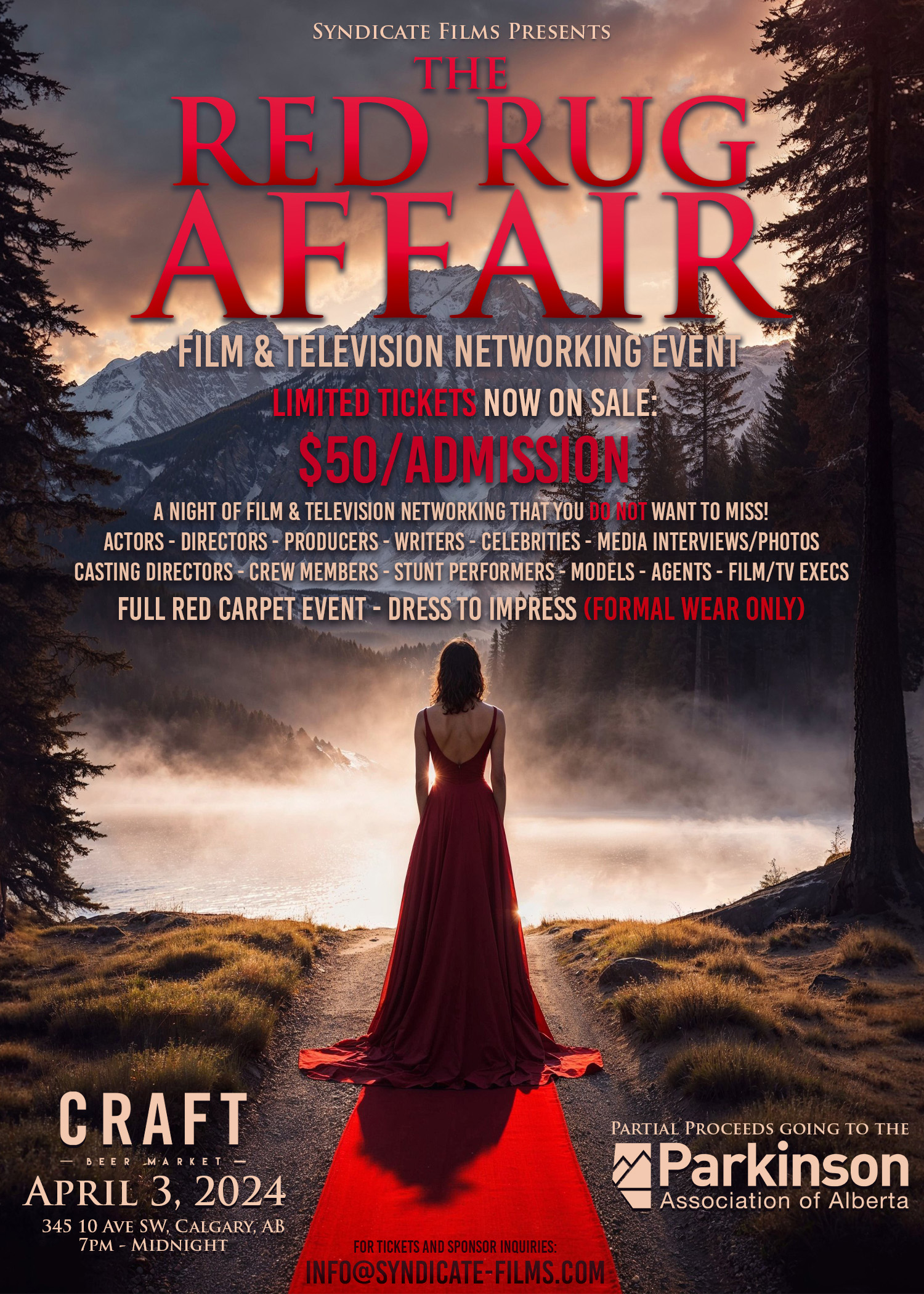 This is a LIMITED TICKET Event with partial proceeds going to the Parkinson Association of Alberta. With a prime location on 10th Avenue Southwest, Calgary, AB, Canada, this in-person Full Red Carpet Event promises to be a night to remember. Don’t miss out on this incredible opportunity to meet and mingle with some of the Industries Biggest Names! Get your tickets today before they sell out! “The Red Rug Affair” is NOT an event you want to miss. See you there!