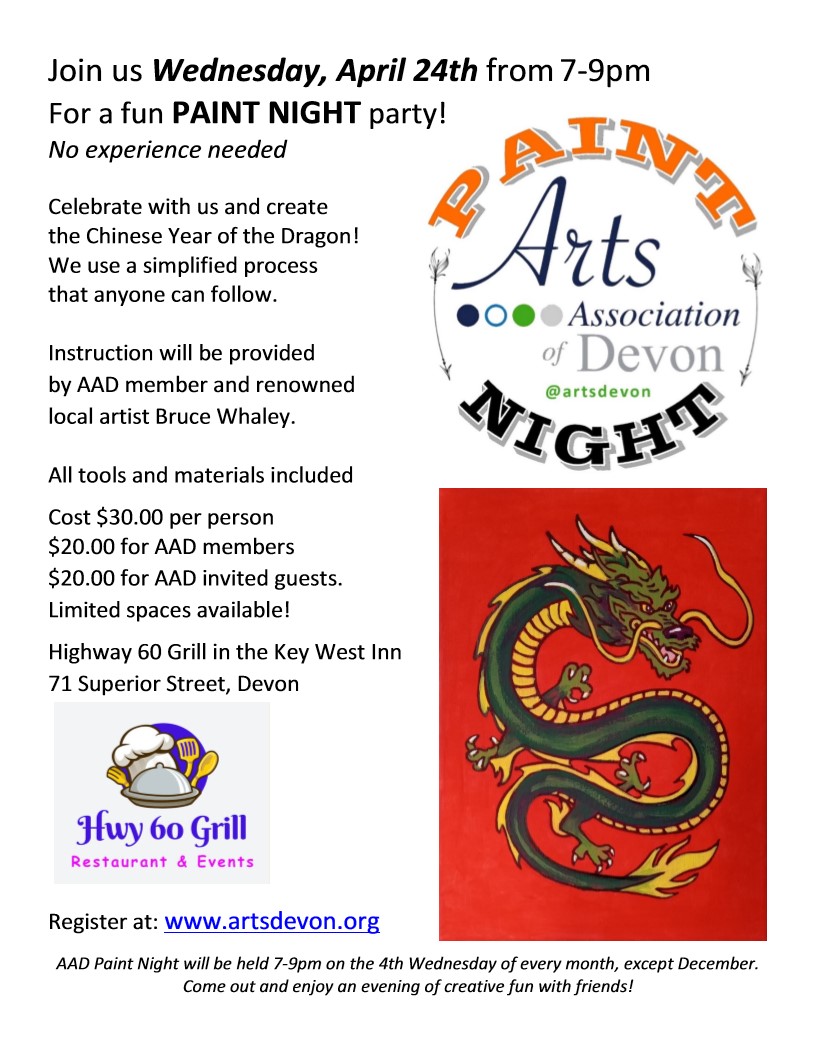 The Arts Association of Devon is holding a Paint Night on Wednesday April 24, 2024, 7-9 PM. No experience necessary. All materials and instructions supplied.
