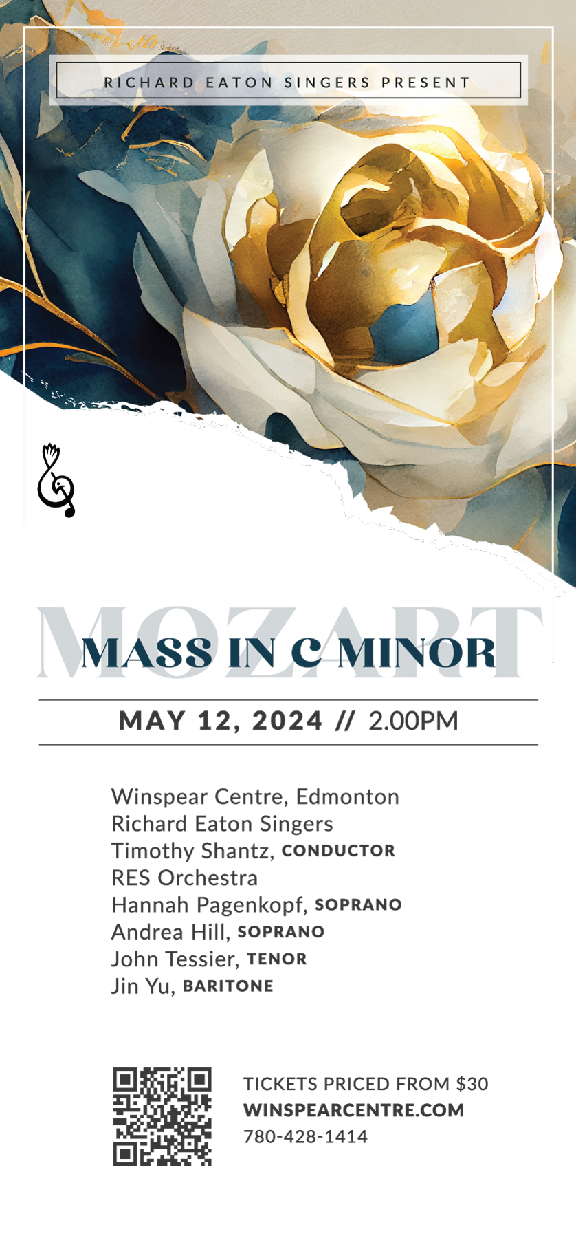 Mozart | Mass in C Minor Sunday May 12, 2024 – 2:00pm Winspear Centre, Edmonton Richard Eaton Singers Timothy Shantz, conductor RES Orchestra Hannah Pagenkopf, soprano Andrea Hill, soprano John Tessier, tenor Jin Yu, baritone An intermission-free concert of Mozart’s incredible Mass in C Minor especially for Mother’s Day. The program will also feature Andrew Balfour’s Mamachimowin (Cree interpretation of Psalm 67) and Zachary Wadsworth’s Benedicite. Tickets priced from $30