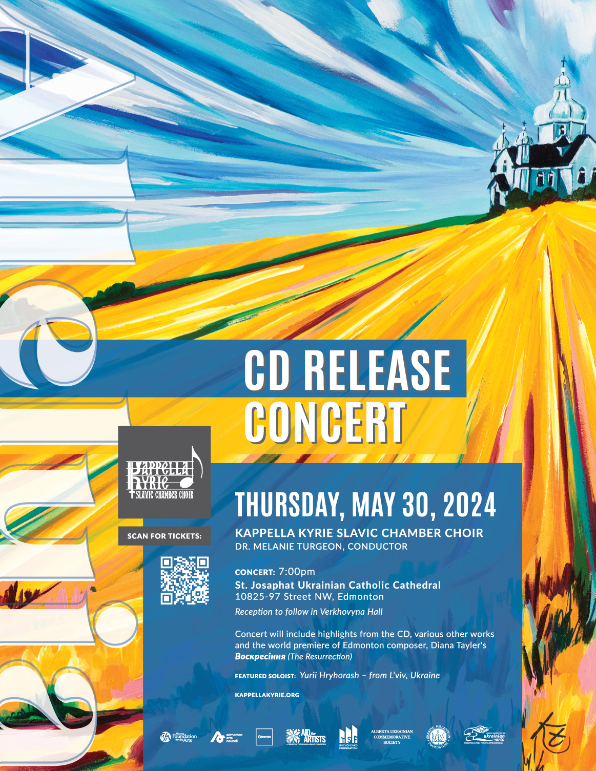 In celebration of their first recording, Kappella Kyrie Slavic Chamber Choir is thrilled to present Alleluia CD Release Concert on May 30, 2024 at St. Josaphat Ukrainian Catholic Cathedral. The concert and recording includes highlights Kappella Kyrie has worked on for the past few years, plus new works from their current season. Audiences will hear everything from Artem Vedel’s Нині отпущаєш (Song of Symeon) to an arrangement of Dolly Parton’s Light of a Clear Blue Morning. The evening features the premiere of Воскресіння (The Resurrection) by Edmonton composer, Diana Tayler, commissioned by Kappella Kyrie. The work is set to a poem by the award-winning Ukrainian poet, publisher, visual artist and political activist Marjana Savka and is about the optimistic spirit of so many Ukrainians fighting for their country.