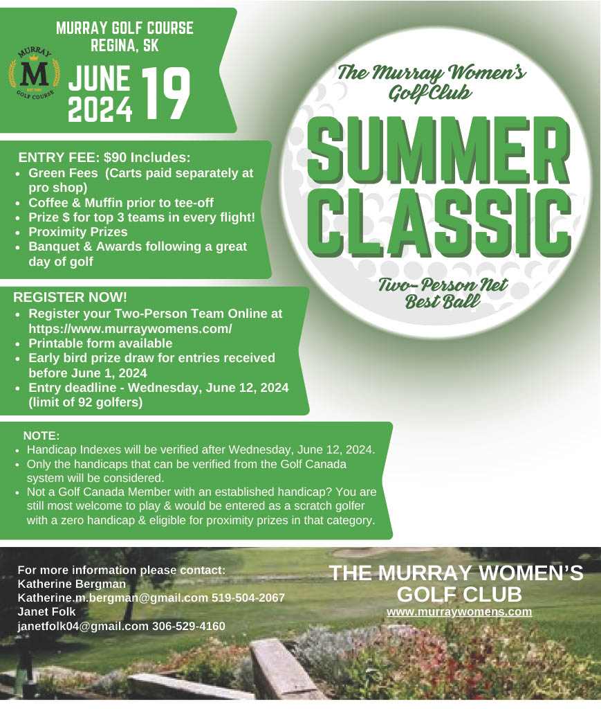 Summer Classic-Two person net best ball. Entry fee includes: Green Fees, Coffee & Muffin prior to tee-off, Prize $ for top 3 teams in every flight, Proximity Prizes, Banquet and Awards following a great day of golf. Early bird prize draw for entries received prior to June 1st; Entry deadline June 12th Limit of 92 golfers