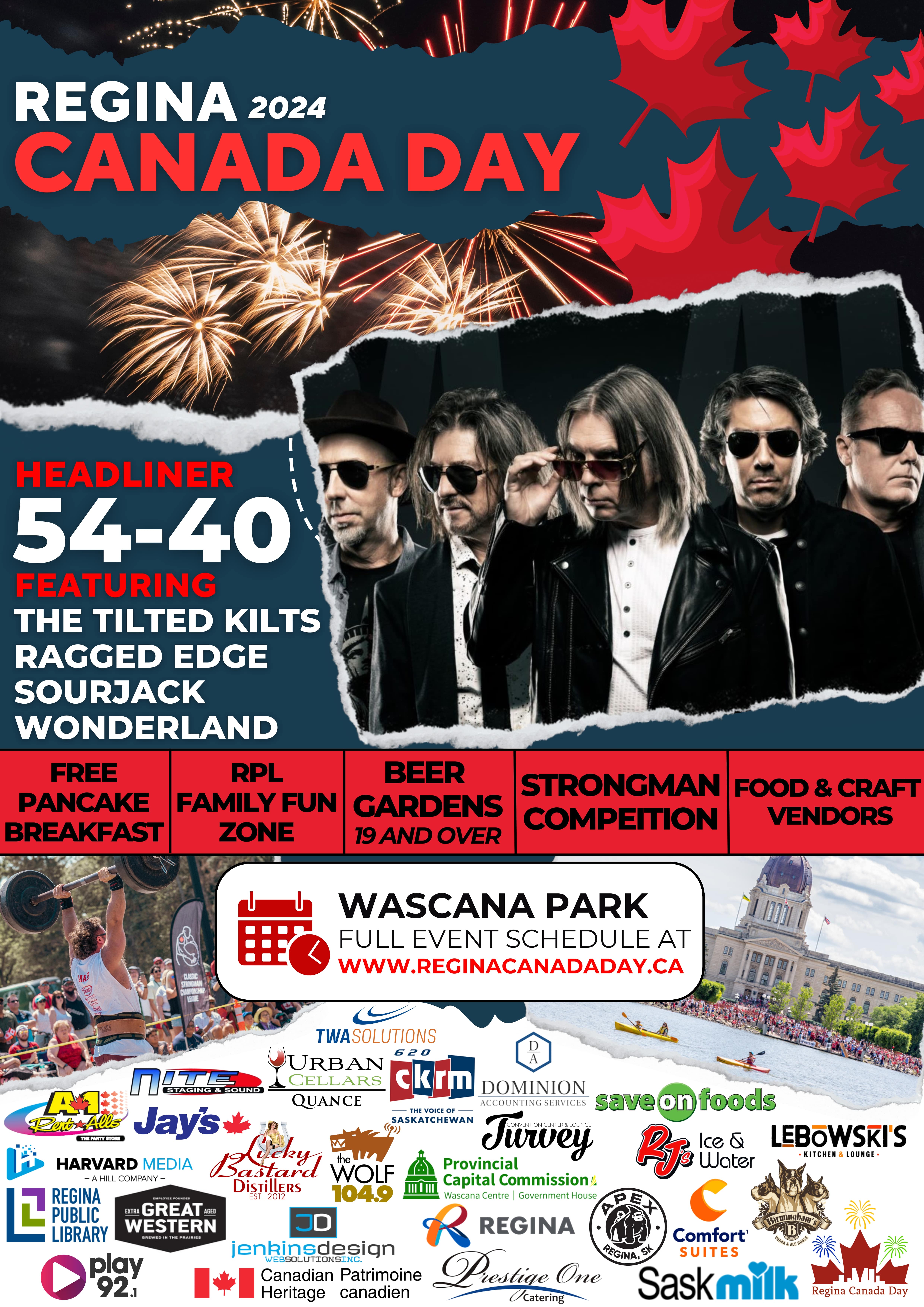 Regina Canada Day 2024 Wascana Park, Regina Pancake Breakfast starts at 8:30 AM Regina Public Library Family Zone starts at 10;00 AM Opening Ceremonies at Noon Beer Gardens opens at Noon Food Trucks, Apex Adventure Zone, Crafters, Strongman Competition and more! Headliner this year is 54-40 Fireworks will start at 10:30 PM http://www.reginacanadaday.ca