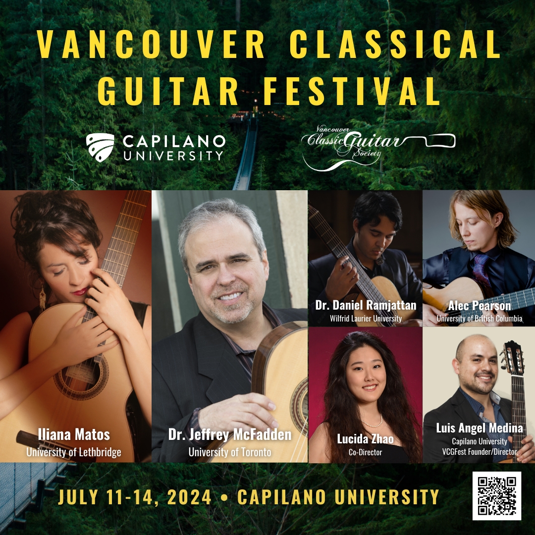 The 2024 Vancouver Classical Guitar Festival July 11th – 14th has a new home at Capilano University and the BlueShore Financial Centre for Performing Arts. Grow your guitar skills or simply enjoy brilliant classical guitar concerts July 12th and 13th at 7:30 pm. Now in its 5th year, the festival boasts Canada’s finest classical guitarists including Dr. Jeffrey McFadden, Iliana Matos, Dr. Daniel Ramjattan, Alec Pearson and Luis Angel Medina. Go to http://www.vancouverguitar.org for complete information, registration and concert tickets.