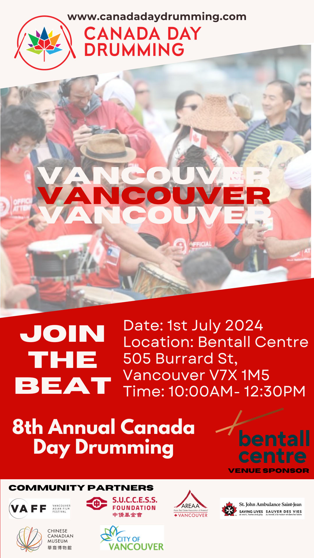 Organized by Legacy 150 Celebrations Society, a Vancouver-based non-profit organization, the annual Canada Day Drumming Celebration (CDD) strives to deepen intercultural understanding, promote patriotism, and enhance civic engagement through one of the world’s most ancient and widely-adopted art forms – percussive arts.