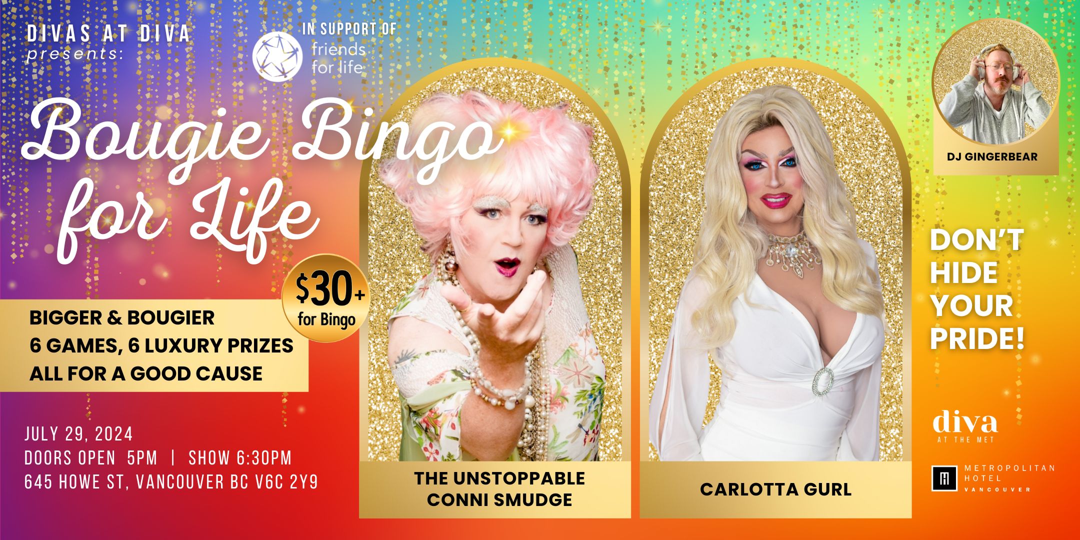 We are thrilled to announce the return of The Unstoppable Conni Smudge to reunite with Carlotta Gurl! This is a rare event to see the duo perform, get your ticket today! Together with our friends at Diva at the Met and the Metropolitan Hotel Vancouver, we are thrilled to bring back Bougie Bingo for Life! $30+ gets you 6 games of bingo with 6 luxury prizes, our grand prize for the evening is a one-night stay at the Metropolitan Hotel Vancouver with breakfast for 2 at Diva at the Met! Happy Hour lasts until 6pm and our bingo balls drop at 6:30pm, we’ll have our new summer menu for you to enjoy as well. 100% of ticket sales and donations go directly to Vancouver Friends for Life Society. Celebrating 30 years this year, the Vancouver Friends for Life Society (VFFLS) is a charitable organization founded on the belief that no one should have to face the many challenges of HIV/AIDS, cancer, hepatitis C, and other life-interrupting illnesses alone. VFFLS offers wellness services and specialized support programs to clients 100% free-of-charge. Services include counselling, expressive art therapy, yoga, acupuncture, weekly lunches, and a wide variety of other programs that offer psychological, spiritual, and practical support. For more information, please visit http://www.vancouverfriendsforlife.ca **We sold out all of our past bougie bingos with our first one selling out in 4 days and our last one sold out 10 days before bingo, this is your sign to get your tickets and kick off Pride!**