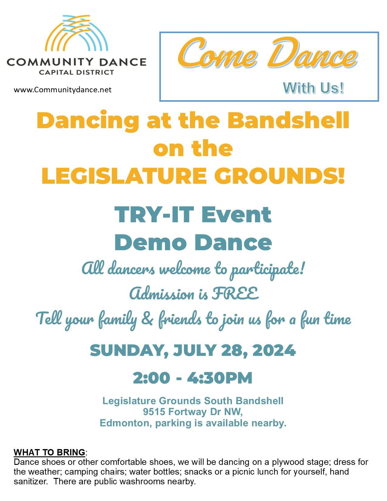 DATE: Sunday, July 28, 2024 TIME: 2:00 – 4:30pm LOCATION: Alberta Legislature Bandshell, 9515 Fortway Dr NW, Edmonton EVENT: picnic/social, dance demo, and a FREE ‘Try-It! Event’! This is a FREE event hosted by CDCDA, no registration required, no experience required. FREE parking at the Terrace Building. Public washrooms nearby. Bring your lawn chairs and water bottles! Square Dance, Choreographed Ballroom, Line Dancing or Clogging, according to dance leader availability. EMAIL: cdcdainfo@gmail.com WEBSITE: communitydance.net