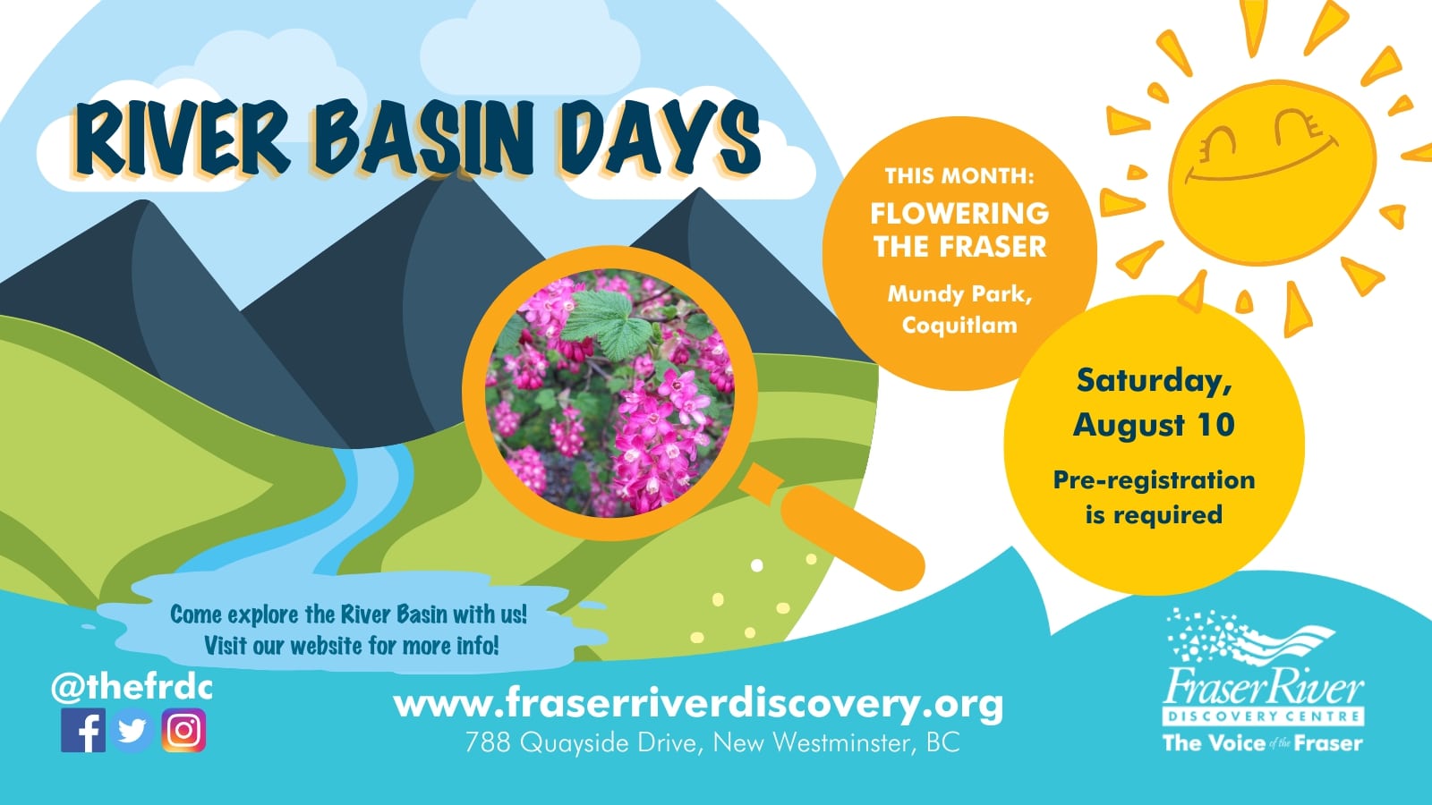 River Basin Days is a series of outdoor public programs for families. Join us at different locations around the Fraser River Basin as we explore this incredible watershed! Our staff will guide you through one hour of activities, experiments, and art projects as we learn about the biodiversity of this great river. Summer’s here and the flowers are in full bloom! This month we’re headed to Mundy Park in Coquitlam to learn about flowers! We’ll look at the different parts of a flower, learn about pollination, and go on a flower walk. Then we’ll plant flower seeds that you can take home! This event will take place rain or shine, so please come prepared for the weather. Registration cost includes admission to the Fraser River Discovery Centre. Pay when you register for this workshop, and the next time you visit the Centre in-person, you will be admitted for free. Click here to register: https://fraserriverdiscovery.org/rbd/ WHEN: Saturday, August 10th, 2:00-3:00 PM and with enough interest, another session will be offered at 12:30-1:30PM. WHERE: Mundy Park (meeting location at the Hillcrest Parking Lot) WHAT: – Learn about flower anatomy and pollination – Discovery and observe flowers in the park – Flower seed planting WHO: While everyone is welcome, this workshop is aimed at children and their families. COST: Includes admission to the Discovery Centre. Specific costs are listed below: – Family Ticket ($20.00 each) – for 2 adults and up to 4 children – Adult Ticket ($8.00) – adult 19 and older – Senior Ticket ($6.00) – senior 65 and older – Student Ticket ($6.00) – student ID required – Child ticket ($5.00) – children aged 3-12 – Children 2 and under register for free COVID-19 Safety: – Pre-registration is required. – Individual group size is limited to five (5) maximum. – Workshop registration limited to five (5) groups. – During the workshop, groups are required to follow physical distancing guidelines. – Masks are recommended.