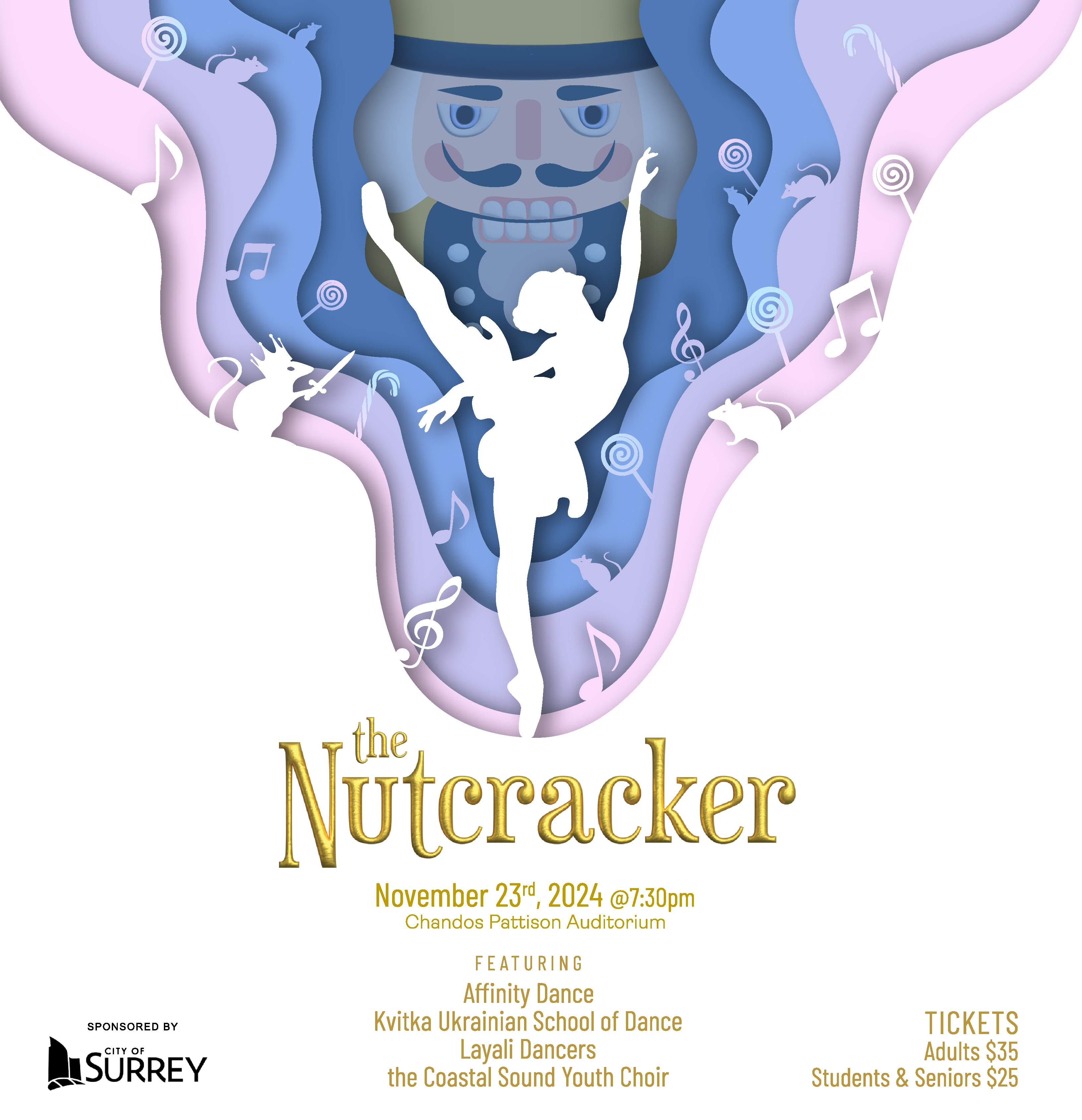 This family friendly version of Tchaikovsky’s holiday classic, features talented local dancers including the Kvitka Ukrainian School of Dance, and the Layali Dancers, onstage with the Surrey City Orchestra and the Coastal Sound Children’s Choir, all conducted by Maestro Leslie Dala. Also presenting in the lobby will be, artists from the Surrey Festival of the Arts. Affordable, and accessible, this performance is suitable for all ages.