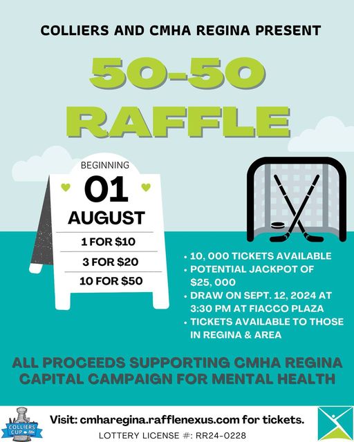 In addition to the Colliers Cup Charity Street Hockey Tournament Canadian Mental Health Association (CMHA) Regina Branch is hosting the Colliers Cup Regina 50-50 Raffle. Tickets are available to those in Regina and Surrounding area. Deadline is Thursday September 12, 2024 at 3:00 PM. Proceeds support CMHA Regina’s Capital Campaign for Mental Health.