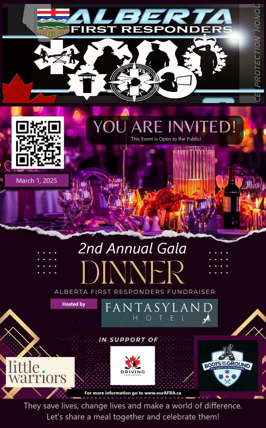 Our 2nd annual appreciation Gala for first responders will be hosted at the Fantasyland Hotel. March 1st 2025. We aim to raise 100k this year. Up from 39K our first year. Evening of cocktails, dinner, speeches and a dance with hundreds of gifts to giveaway as well as over 60 silent auction items/packages. We have invited the Premier, Deputy Premier, Minister Turton, Minister Dan Williams,