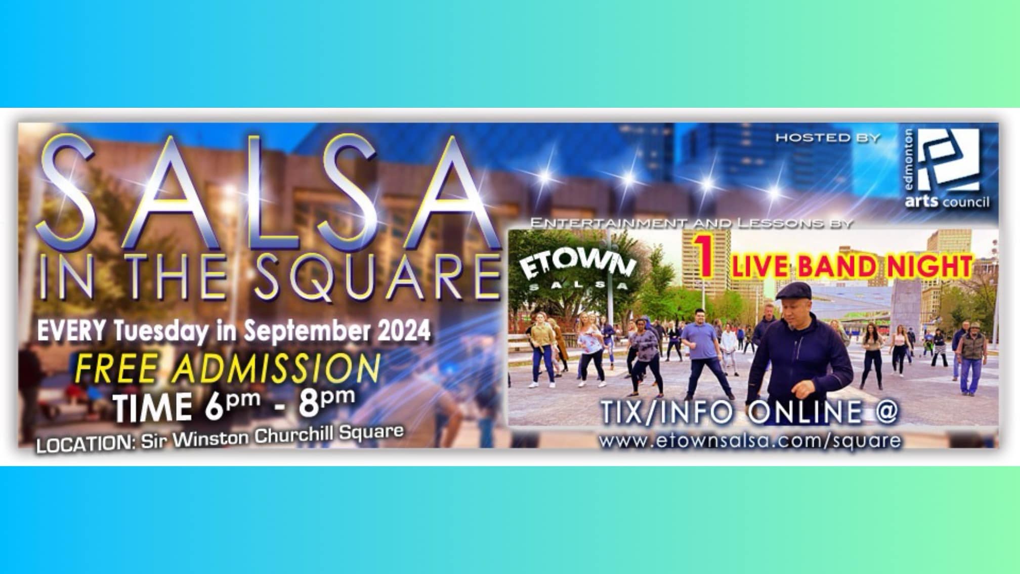 WHERE: Sir WInston Churchill Square , Edmonton WHEN: Every Tuesday in Sept 2024 CONTACT INFO:n/a TICKET INFO: FREE EVENT but register EXTRA DETAILS: From the same organizers that brought you Salsa’n’Skate, Salsa In The City, and Salsa in the Square 2021-2024, The Arts Council of Edmonton in association with ETOWN SALSA have brought you another weekly FREE EVENT for the whole month of SEPTEMBER 2024 that we are sure you will enjoy! We are super excited to have for the grand finale 1 LIVE BAND NIGHT with RUMBA CALIENTE to offer everyone! Tell you friends , co-workers and family to come join us for a FREE FAMILY FRIENDLY EVENT! On Sept 24, we will be featuring ‘RUMBA CALIENTE’! for a two (1 hour) sets that will also have 2 half hour dance lessons for everyone to enjoy! This evenings will extend an extra hour so they will go from 6-9pm and on the other nights it will go from 6-8pm. Each night will feature a different dance lesson and dance genre! Here is a schedule of the dance lessons for each night! Classes will run weather permitting. The class will be: Beginners 6pm Intermediate 6:30pm. Merengue Sept 3 Cumbia Sept 10 Bachata Sept 17 Salsa Sept 24