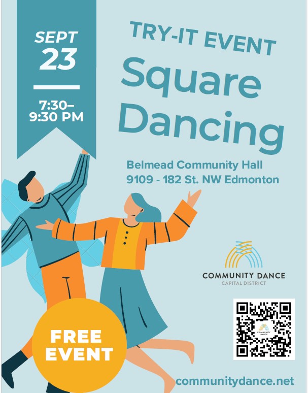 DATE: Monday September 23, 2024 TIME: 7:30 – 9:30pm LOCATION: Belmead Community League Hall, 9109 – 182 St. NW, Edmonton T5T 2Y9 EVENT: FREE ‘Try-It! Event’! This is a FREE event hosted by CDCDA, no registration required, no dancing experience required. Learn the basic steps of Square Dancing! It’s FUN and it’s EASY! FREE parking EMAIL: cdcdainfo@gmail.com WEBSITE: communitydance.net
