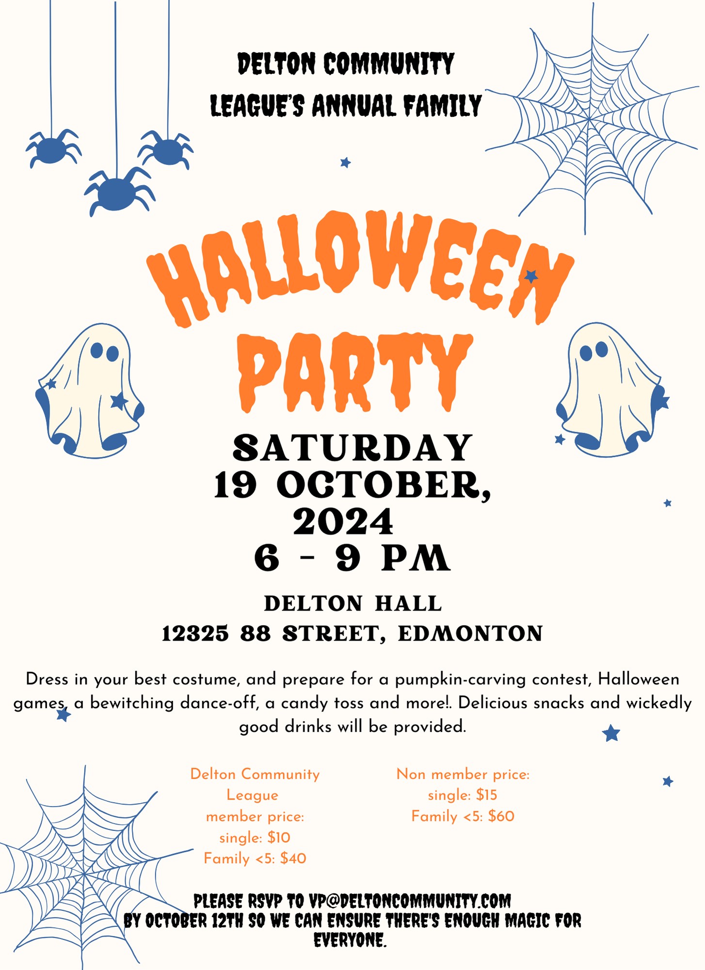 Delton Community League is excited to invite you to their Annual Family Halloween Party! Join us for a spook-tacular evening filled with fun, games, pumpkin carving, music and treats for kids of all ages. Don’t forget to come in your best costume! Event Details: Date: Saturday, October 19th Time: 6:00 PM – 9:00 PM Location: Delton Community Hall Please RSVP to VP@deltoncommunity.com by October 12, 2024. We can’t wait to see you there for a night of Halloween fun!