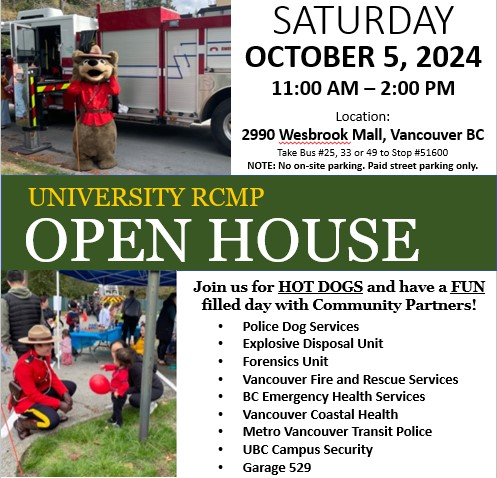 Join the University RCMP for its upcoming Open House on Saturday, October 5th, 2024! This family friendly event starts at 11:00am and ends at 2:00pm. Get a photo with a Mountie in Red Serge and Safety Bear! Meet officers, staff, and community partners in public safety serving the University Endowment Lands!