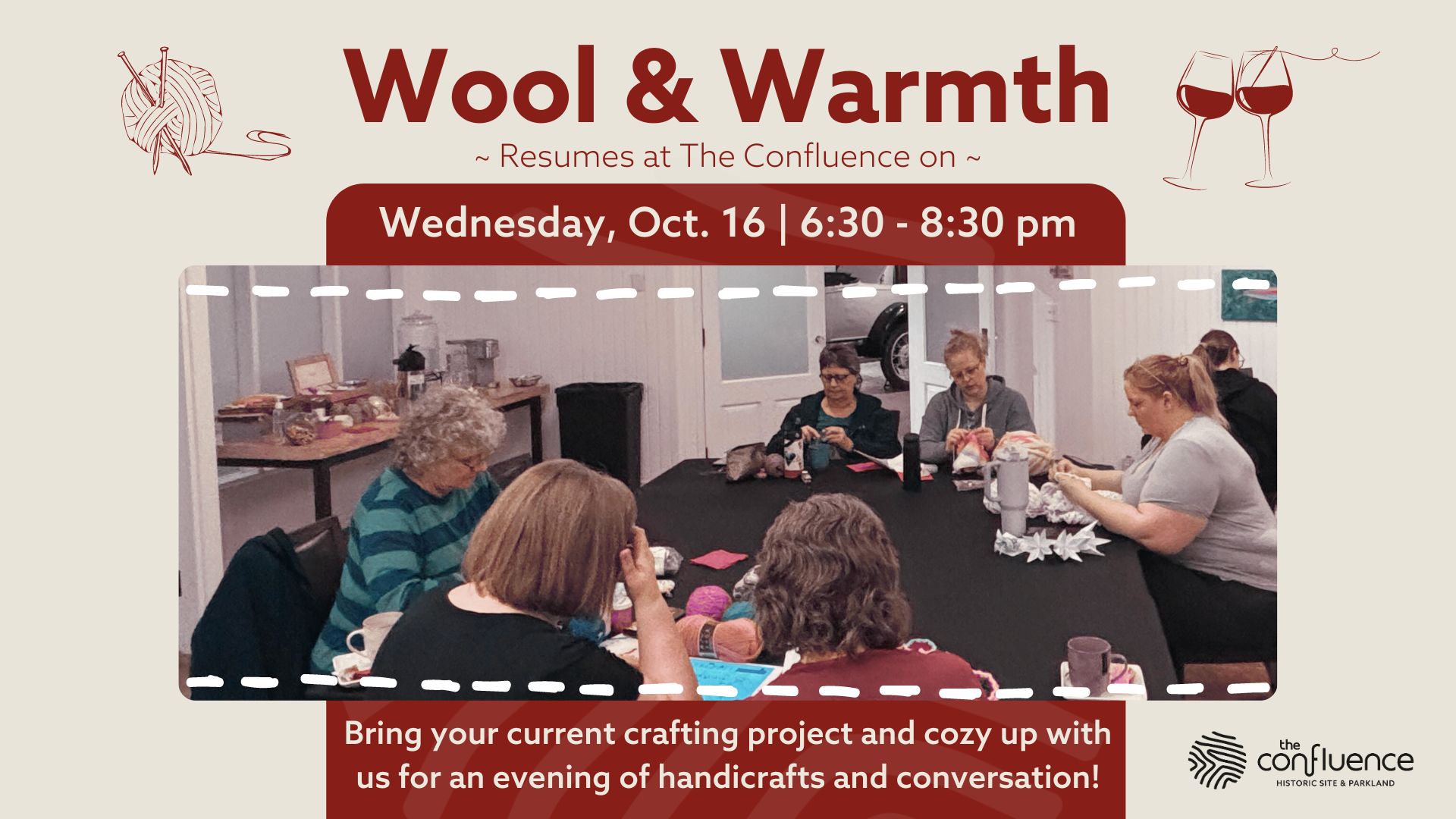 Calling all knitters, crocheters and crafters, Wool & Warmth is back! Bring your current crafting project and cozy up with us at The Confluence for an evening of handicrafts and conversation as the weather cools down and autumn settles in. Connect with your community over a glass of wine and some laughs and take a stroll around the cultural centre with included after-hours admission! Tickets include complimentary light refreshments and cultural centre admission. Additional beverages, snacks and alcohol available for purchase.