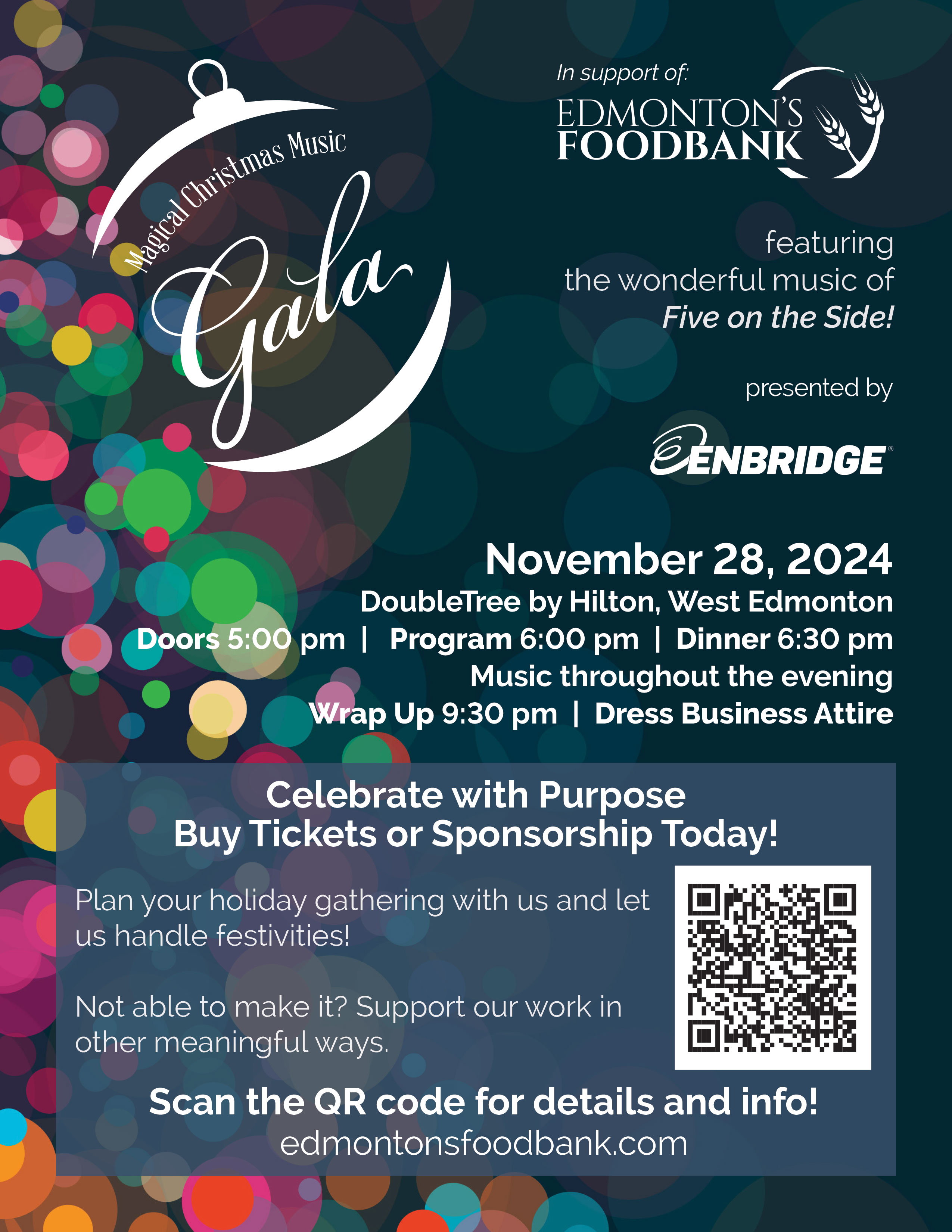 Celebrate the festive season with Edmonton’s Food Bank and help them raise funds through their annual Magical Christmas Music Gala! Bring YOUR staff holiday party to this event and enjoy a fantastic evening of food and music while being philanthropic too! You’ll be treated to an amazing three-course meal, a fantastic live music performance by Five on the Side, and the satisfaction of supporting a vital cause in the community while having a great time!