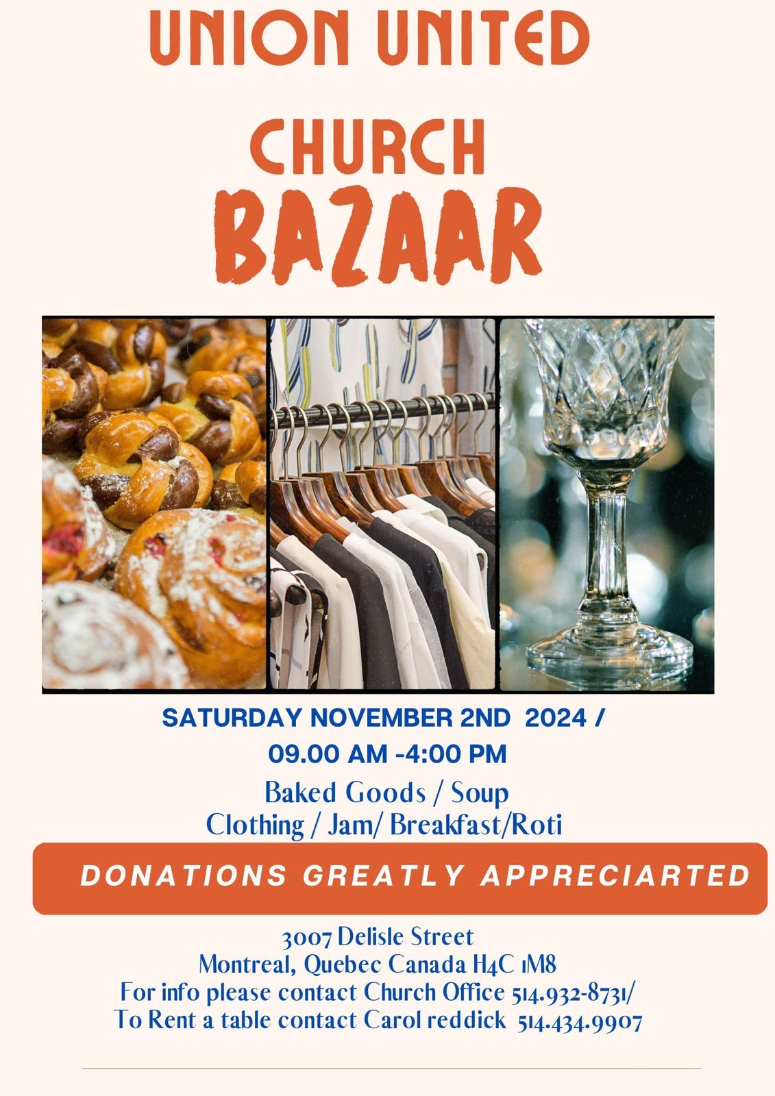 The Annual Union United Church Bazaar will be held on Saturday, November 2nd from 9:00 a.m. to 4:00 p.m. at 3007 Delisle Street, Montreal (Lionel-Groux Metro). There will be brand new winter jackets, baked goods, breakfast, rotis, Caribbean drinks and more! Come for lunch or for a coffee. Call the Church Office (514-932-8731) or send an email to nique745@icloud.com for more information.