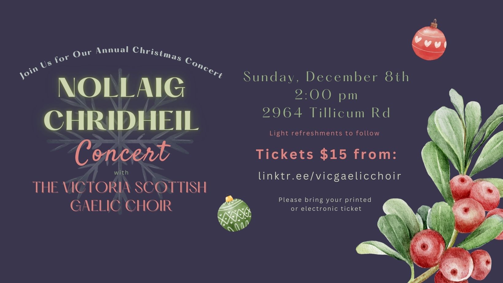 Nollaig Chridheil! Join The Victoria Scottish Gaelic Choir for our annual Christmas concert! Enjoy a warm and cheerful afternoon of traditional Scottish Gaelic music along with new and old holiday favourites. There will be tea and light refreshments following the performance. 2:00 PM December 8th at 2964 Tilicum Rd (Trinity Presbyterian Church) Tickets are $15 and can be purchased at http://www.eventbookings.com/b/event/victoria-gaelic-christmas Please purchase your ticket in advance and bring it to the door.