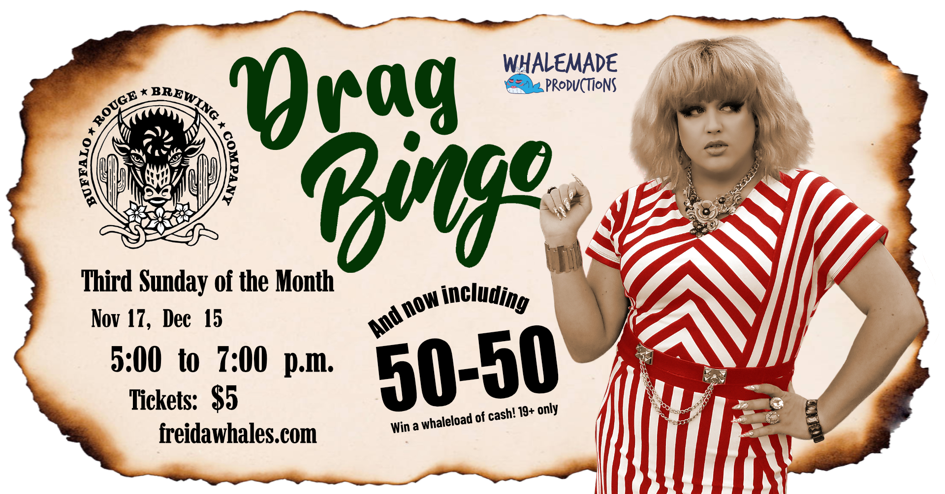 The longest-running drag game night now at Buffalo Rouge – the hottest new place in the North End! Beers, bingo, and a banging menu! Every third Sunday of the month, we will play rounds of music and traditional bingo. Pre-purchase tickets to reserve your spot! From 5:00 p.m. to 7:00 p.m. Tickets: $5 tickets +GST Brought to you by Whalemade Productions