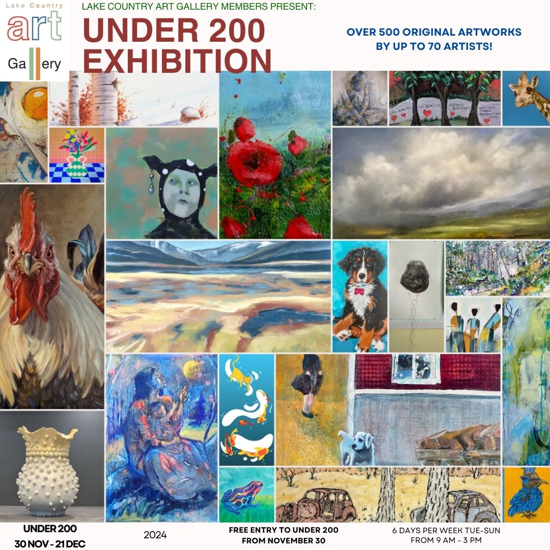 Lake Country Art Gallery members were invited to participate in our largest annual show of the year: Under 200! π¨β¨ ALL artwork is $200 and under, making it the perfect opportunity to snag a unique gift for friends, treat yourself to a stunning art piece, or even pick up a one-of-a-kind tree ornament. ππ This unique Exhibition and Fundraising Sale features new, original artworks for under 200$ from nearly seventy of our amazing member artists. Whether youβre a collector, a gift-giver, or simply an art lover, this show offers something special for everyone. ποΈ Come explore an incredible selection of local art and celebrate creativity this holiday season. Whether you’re shopping or simply soaking in the inspiration, this cozy gallery visit is the ultimate festive activity. Mark your calendars and come experience this vibrant showcase of creativity and community by this year’s artists: Angela Bonten, Angelika M. Offenwanger, Anne Gidluck, Barbara Bell, Beryl Beaupre, Barbara Barnes, Carney Oudendag, Chris Arlidge, Chantel Thederahn, Carol Zuckerman, Diane Blakeley, Diane Davis, Danielle Harshenin, Delora Lalande, Debby Merkel, Diane Nelson, Dianne Postman, Denise Patrick, Elizabeth Shaw, Faye Eden, Frieda Martin, Fay Wolfenden, Gail Hourigan, Heidi Samida, Judy Hamilton, Jane Moxon, Jax Rieger, Jenny Wright, Kathy Hale, Karen Murray, Kathryn Ross, Kathy Short, Kelly Swallow, Katie Szarek, Kate Tooke, Kelly Taylor, Lynden Beesley, Lillian Sokil, Lynette Stebner, Michelle Droettboom, Michael Griffin, Mary Hinz, Monique Jansen, Margaret Kyle, Maureen Lejbak, Marlene G. McPherson, Marla Wilson, Nancy Collins, Olga Malevich Sediako, Paula Charter, Paul Lewendon, Ramona Hoeft, Ria Hakker, Robin Taylor, Sephorah Hild, Sofie Hartwick, Shelley Johnson, Sharlene McNeill, Susan Moore, Sara Wiens, Susan Yost, Tess Letailleur, Tina Siddiqui, Valerie Limpright, Zaph Vouladakis